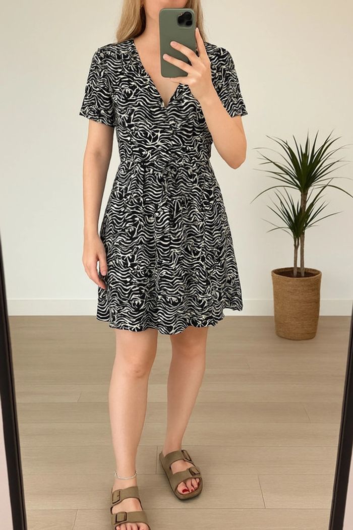 Robe courte en 100 % viscose, imprimé noir et blanc zébré avec détails palmiers. Coupe fluide et féminine, col V croisé avec bouton de maintien, manches courtes légèrement froncées et taille marquée pour une silhouette équilibrée. Tissu léger, agréable à porter, parfait pour un look casual ou plus habillé selon les accessoires. Très bon état, aucun défaut, taille bien pour un 36. ℹ️ Photo portée générée à titre illustratif, pour vous donner une idée du rendu.