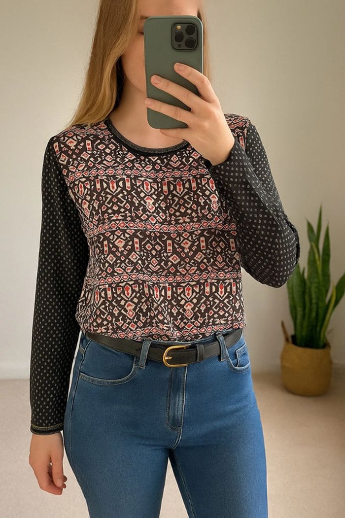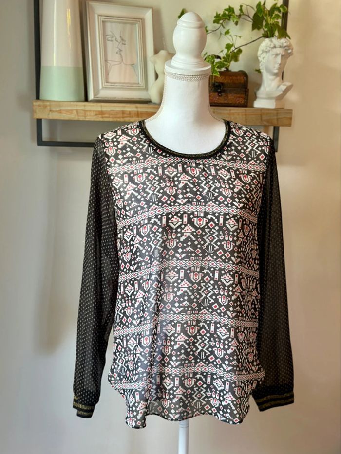 Blouse fluide à manches longues avec col rond souligné d’un liseré doré, imprimé géométrique sur le devant et motifs fins sur les manches. Coupe droite et matière légère (100 % polyester), agréable à porter, idéale pour un style casual chic ou plus habillé. Très bon état, sans défaut. ℹ️ Photo portée générée à titre illustratif, pour vous donner une idée du rendu.