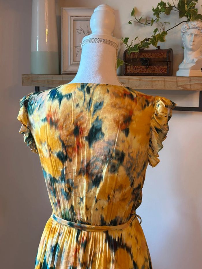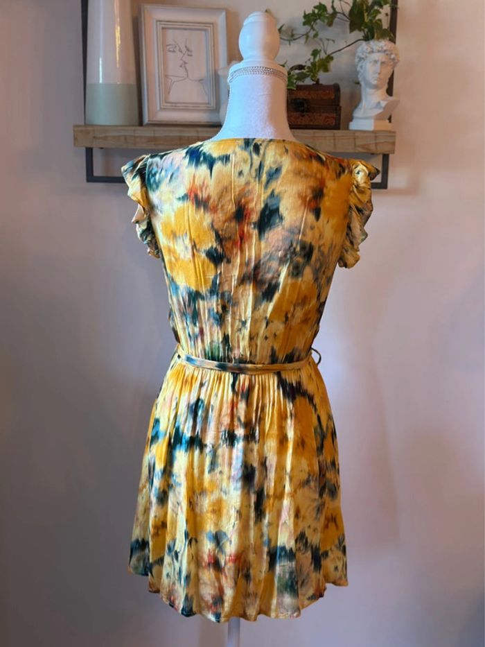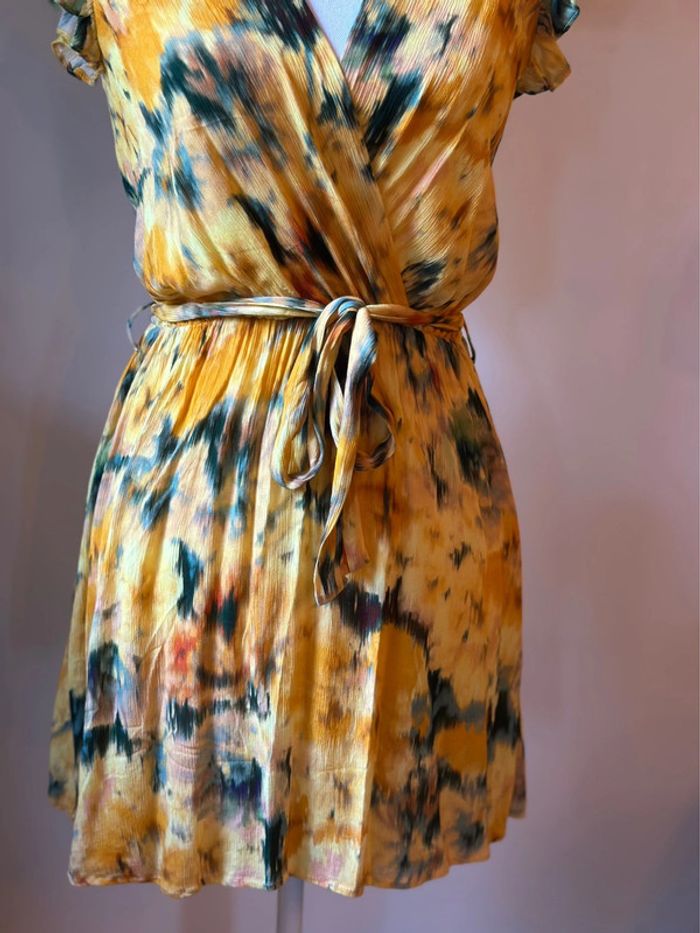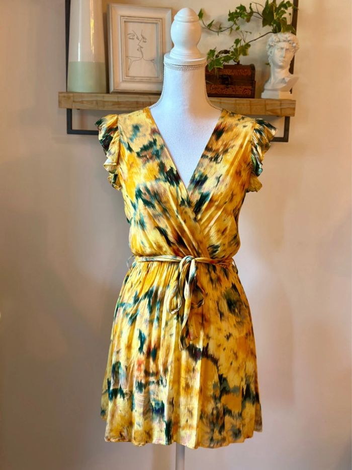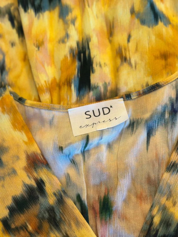 Robe fluide de la marque Sud Express, modèle Reen, en viscose légère. Coupe portefeuille avec col V croisé, volants sur les épaules et taille élastiquée pour une silhouette mise en valeur. Imprimé jaune aux touches vertes, parfait pour l’été. Longueur mi-cuisse, sans manches. Très bon état, portée une seule fois. Taille 34, coupe fidèle. Composition : 100 % viscose. ℹ️ Photo portée générée à titre illustratif, pour vous donner une idée du rendu.