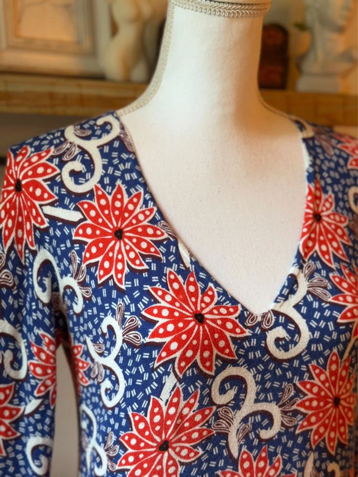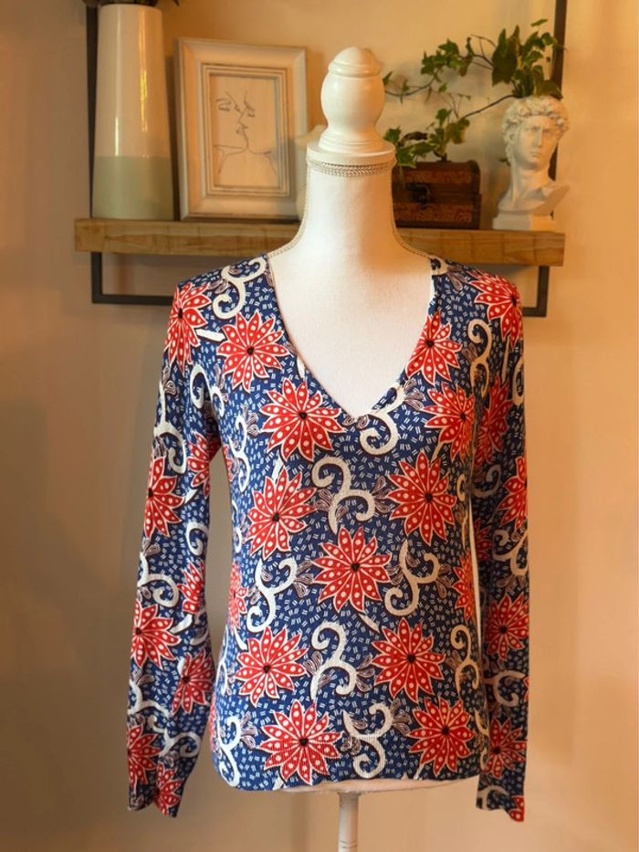 Pull imprimé wax à col V en coton bio Manches longues Maille fine Finitions bord-côtes aux manches et à la base BIO : la fleur de coton ayant servi à la confection de cet article est cultivée selon les principes de l'agriculture biologique, qui interdit l'utilisation de pesticides et d'engrais de synthèse. La taille convient bien. Très bon état. ℹ️ Photo portée générée à titre illustratif, pour vous donner une idée du rendu.