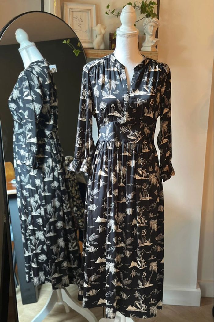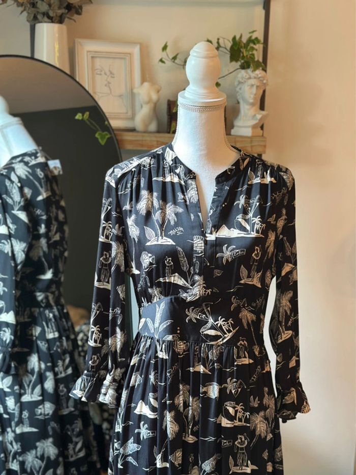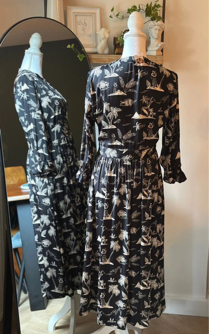 Robe longue à la coupe fluide et légère, manches 3/4, col fermé pouvant s’ouvrir en V selon le style souhaité, fermeture sur le devant. Jolis motifs tropicaux mêlés à des détails inspirés de l’Égypte. Longueur d’environ 125 cm, tissu doux et agréable à porter. Comme neuve, en très bon état, prix d’achat 159 €. Taille parfaitement un M. ℹ️ Photo portée générée à titre illustratif, pour vous donner une idée du rendu.