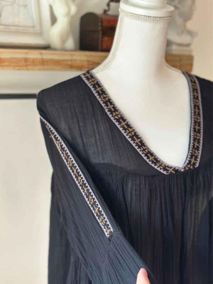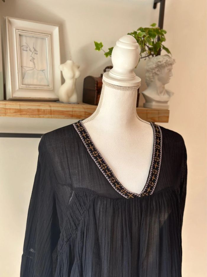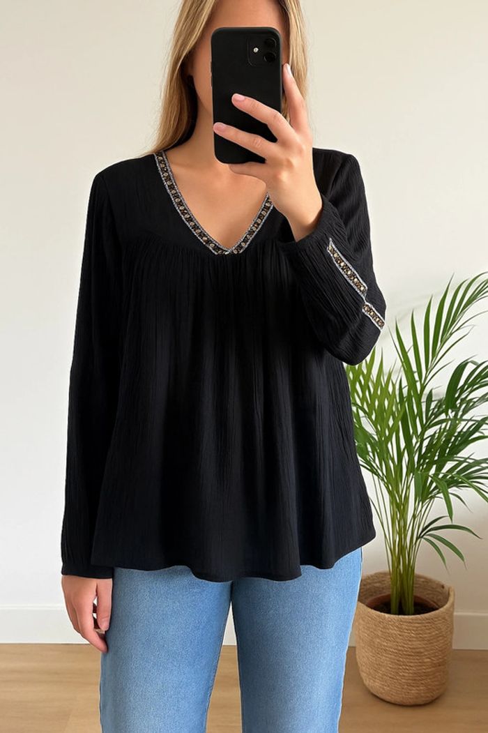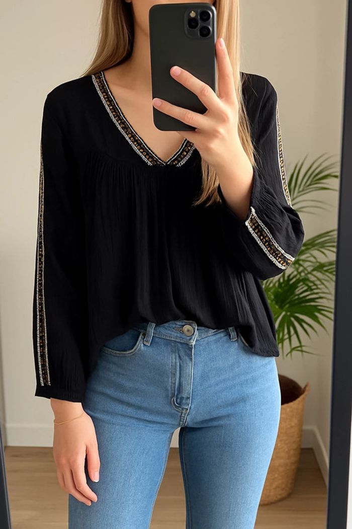 Blouse légère noire en viscose, coupe ample et fluide, avec col en V et manches longues. Finitions brodées dorées et bleu nuit au col, poignets et manches pour un rendu chic mais facile à porter. Matière douce et légèrement transparente. Taille M, taille normalement. Très bon état, aucun défaut. ℹ️ Photo portée générée à titre illustratif, pour vous donner une idée du rendu.