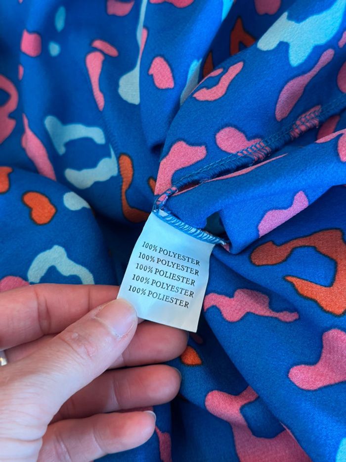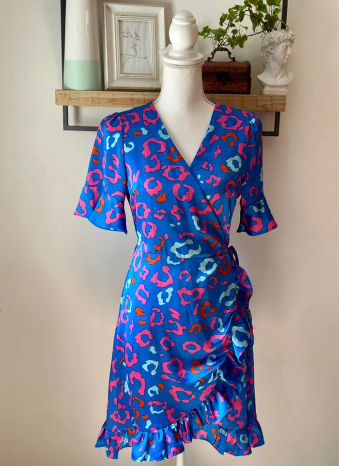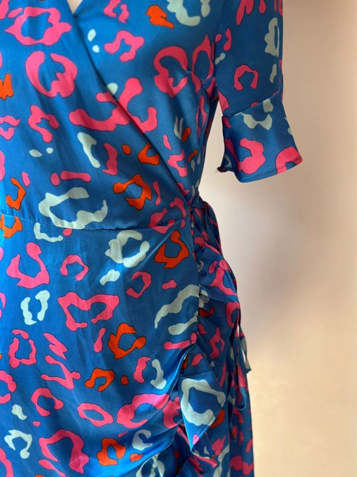 Robe légère et fluide à imprimé façon léopard dans des tons bleu, rose et rouge. Coupe portefeuille avec lien à nouer, ce qui permet d’ajuster facilement la taille. Longueur environ 90 cm, manches courtes et col en V. La taille L tombe bien. Très bon état, aucun défaut. ℹ️ Photo portée générée à titre illustratif, pour vous donner une idée du rendu.
