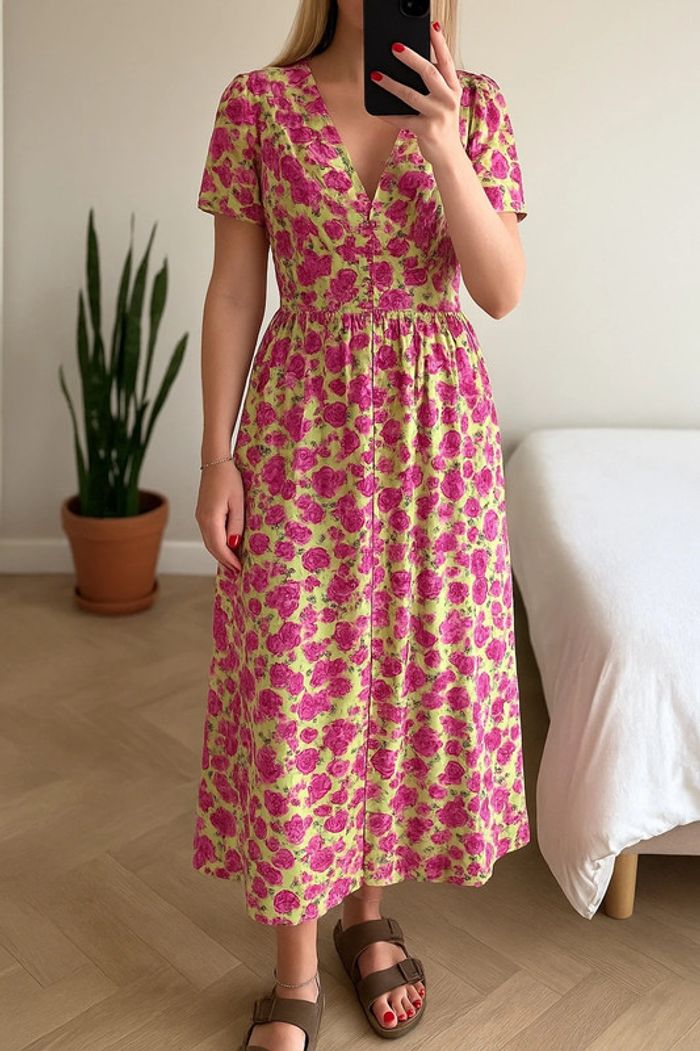 Robe longue d’été à imprimé fleuri dans des tons rose et vert clair, coupe fluide et légère, parfaite pour la saison. Longueur environ 130 cm. Taille S bien respectée. Article neuf avec étiquette encore attachée (prix d’origine 49,95 €). ℹ️ Photo portée générée à titre illustratif, pour vous donner une idée du rendu.