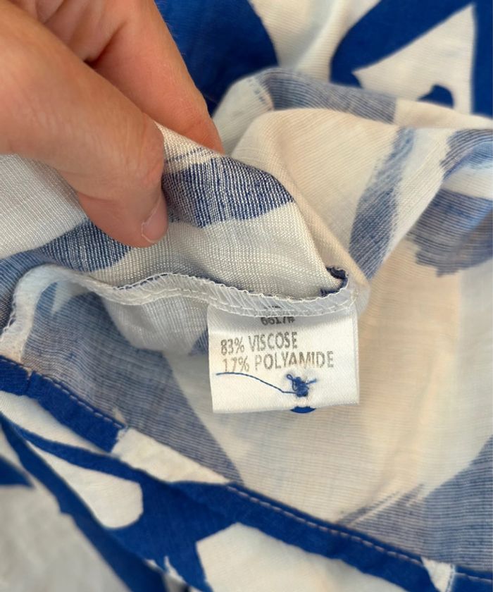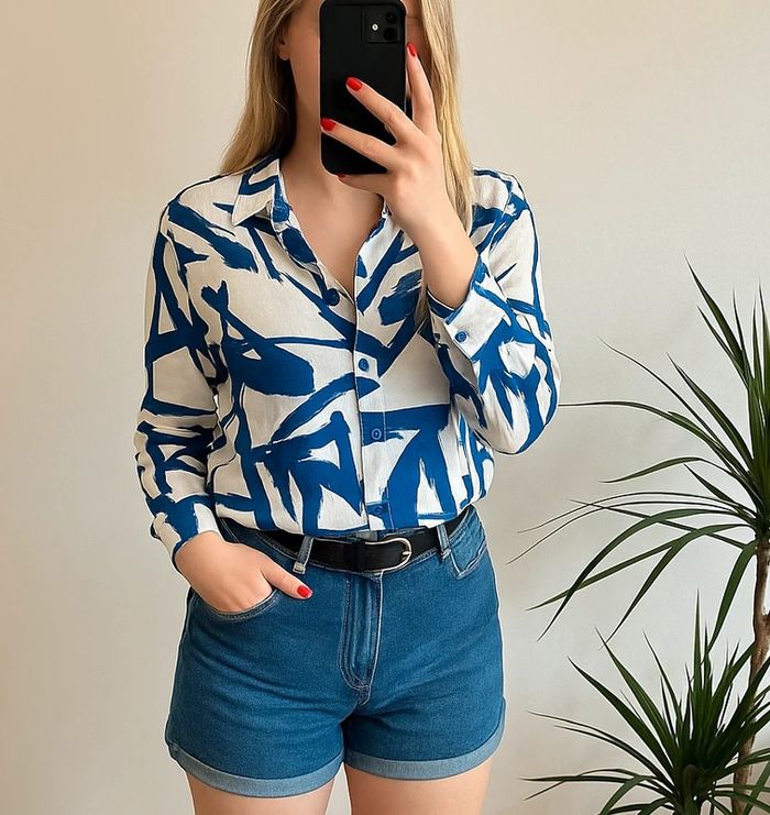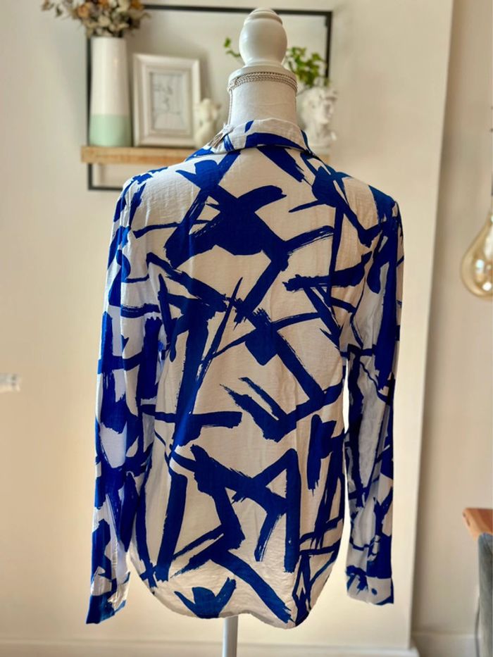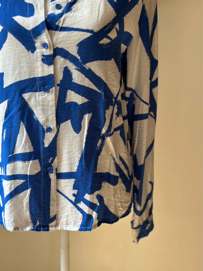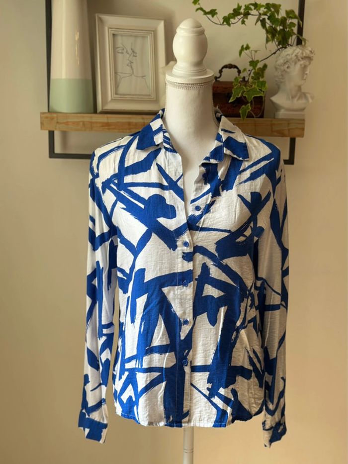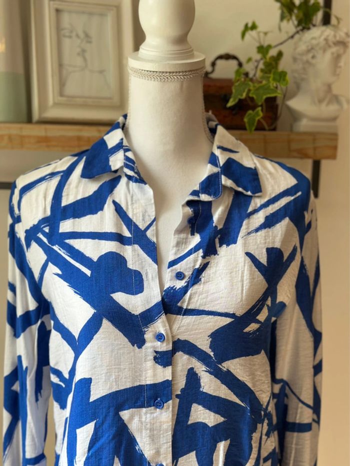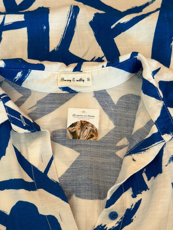 Chemise fluide en viscose avec imprimé bleu vif sur fond blanc. Coupe droite, col classique, boutonnée sur le devant. Matière légère et agréable à porter, parfaite pour les beaux jours. Taille S bien respectée. En parfait état, aucun défaut. ℹ️ Photo portée générée à titre illustratif, pour vous donner une idée du rendu.