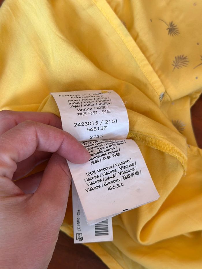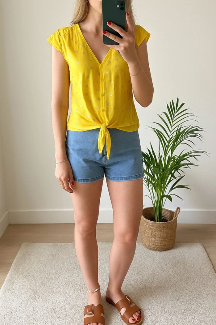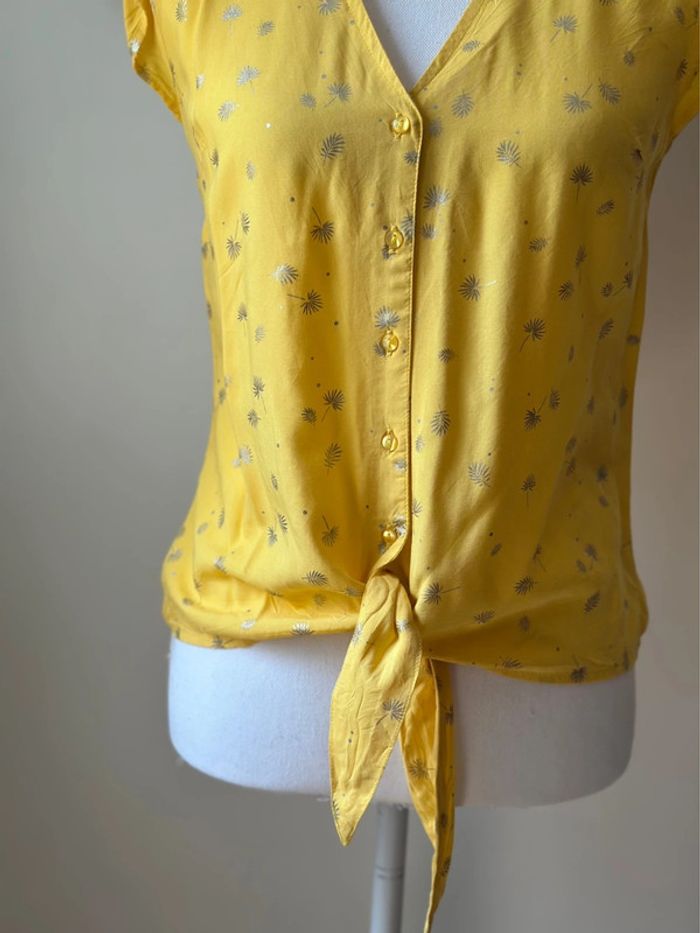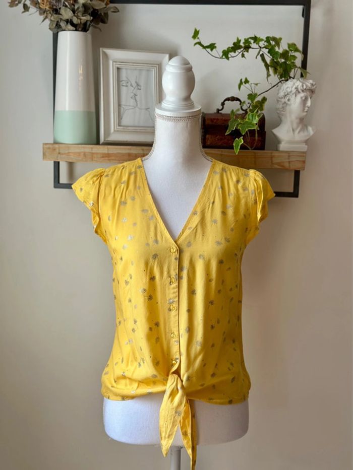 Blouse légère à manches courtes volantées, col en V, boutonnage sur le devant et lien à nouer à la taille. Tissu jaune vif orné de petits motifs dorés discrets. Coupe fluide et estivale, parfaite pour un look décontracté. 100 % viscose, très agréable à porter. Neuve avec étiquette, aucun défaut. ℹ️ Photo portée générée à titre illustratif, pour vous donner une idée du rendu.