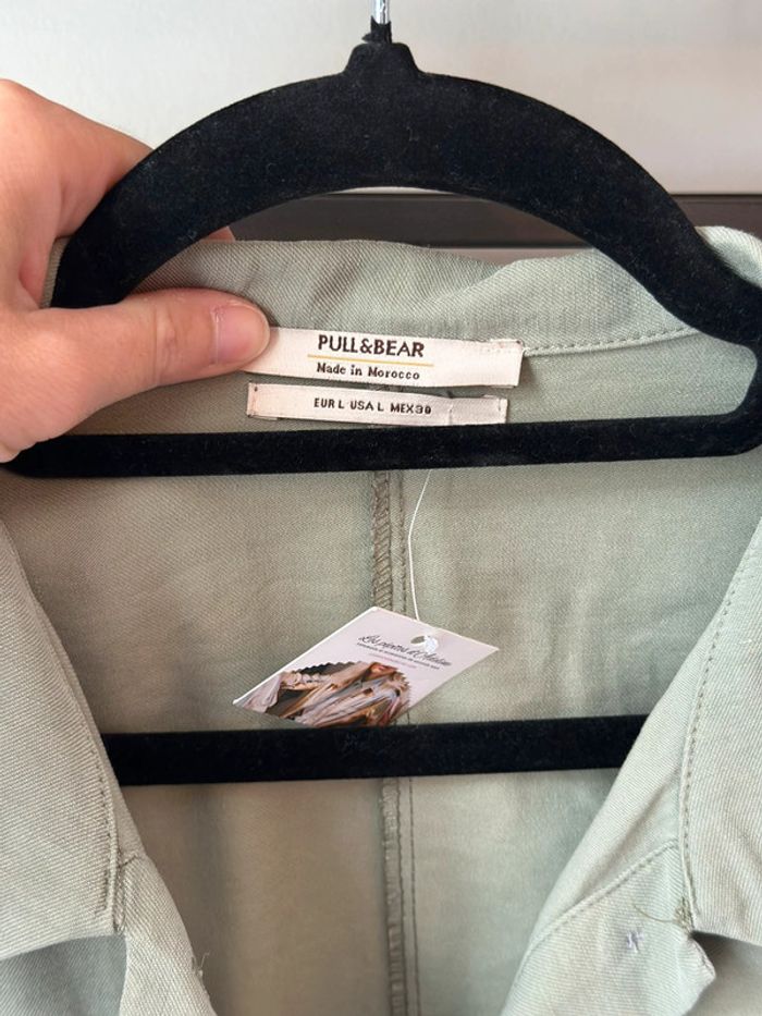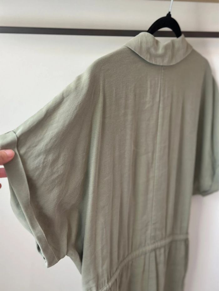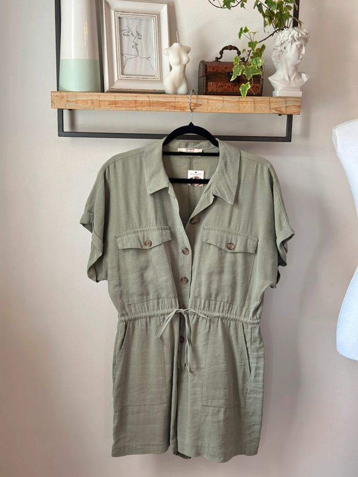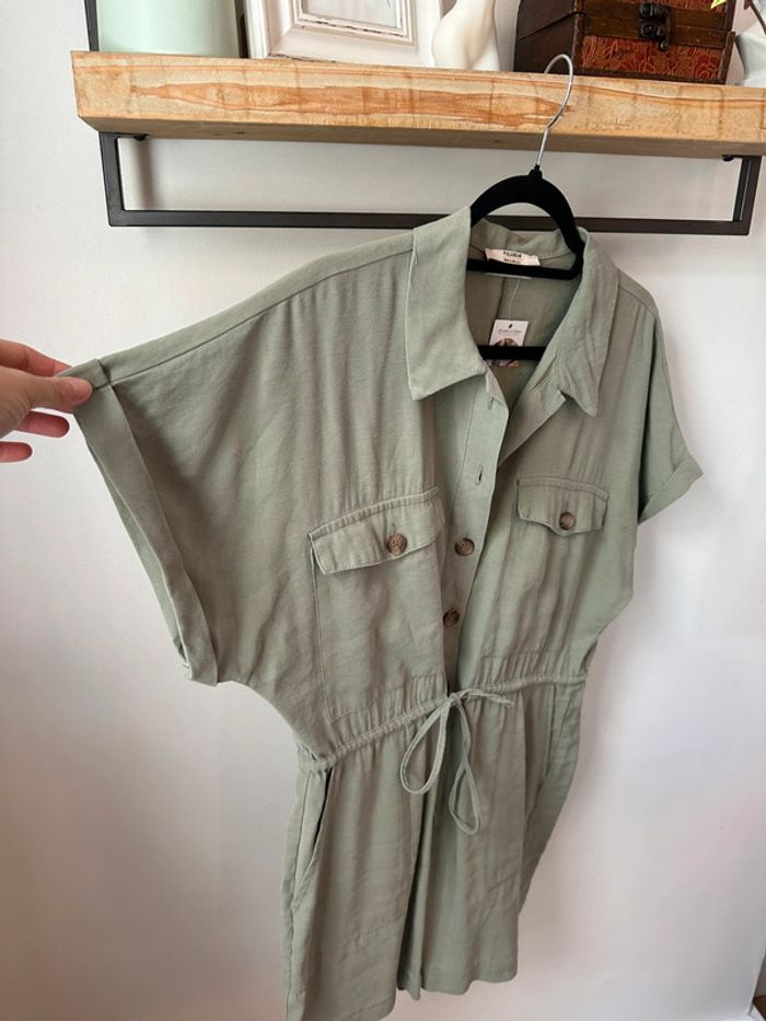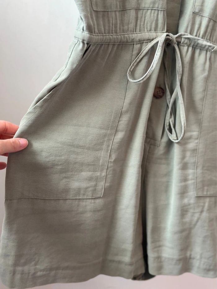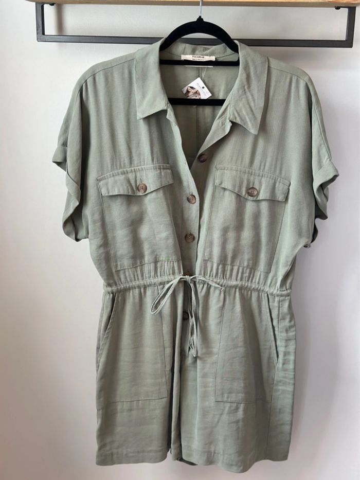 Combishort kaki Pull&Bear, coupe droite avec taille élastiquée et cordon ajustable, col chemise, manches courtes retroussées et boutonnage central. Deux poches poitrine à rabat et deux grandes poches devant. Style casual, fluide et confortable, parfait pour l’été. Très bon état. En viscose. ℹ️ Photo portée générée à titre illustratif, pour vous donner une idée du rendu.