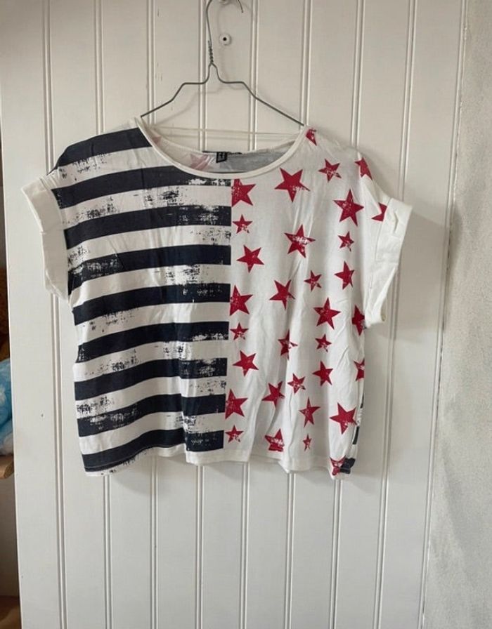 Vends tee shirt court ( Crop Top) blanc avec des rayures bleu et étoiles rouges , taille M de la marque Jennyfer. Composition 100% coton Je le vends 2 euros.
