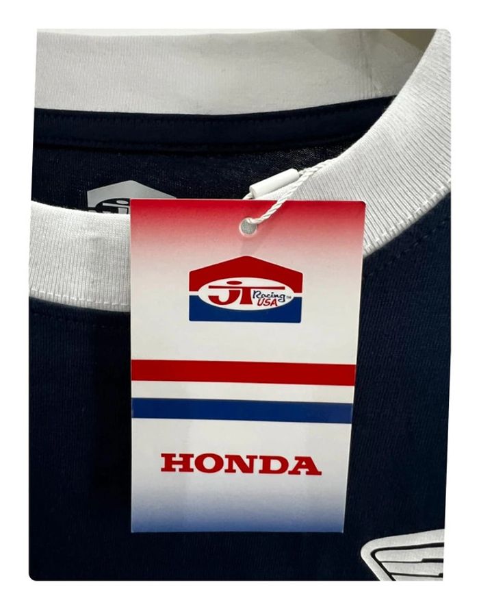 Uniquement par Mondial Relay. Pense à consulter mes autres annonces afin de regrouper les ventes. T-shirt officiel sous licence HONDA par JT Racing USA, édition Racing Team. Modèle homme – taille XS – coupe droite – 100% coton – coloris bleu marine, blanc et col contrasté. Produit neuf avec étiquette (prix d’origine : 25,99 €). Licence officielle Honda – vendu en collaboration avec Celio*. Référence : LDEHONDA4. Parfait pour les fans de moto, auto, ou de vêtements sportswear rétro inspirés des circuits.