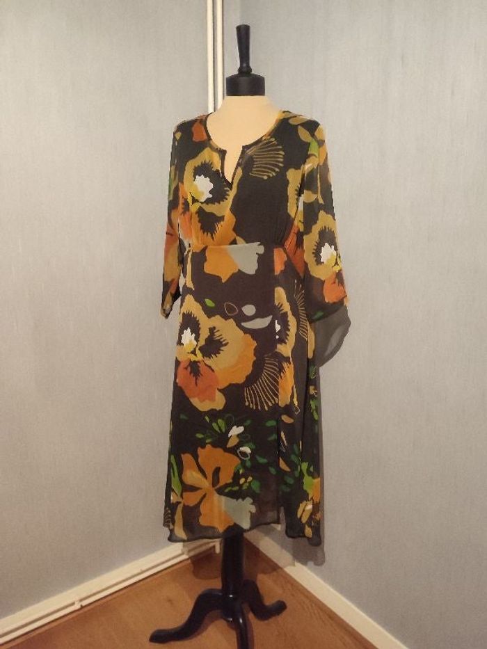 Robe mi longue Trend by Captain Tortue Taille 46 Doublure noire 100% coton Imprimé fleurs Longueur asymétrique plus long derrière et fendue devant Manches 3/4 boutonnées Zip fermeture sur le côté Prix d'achat 119€ Neuf jamais portée