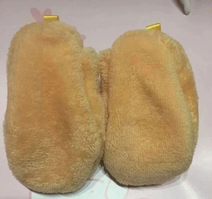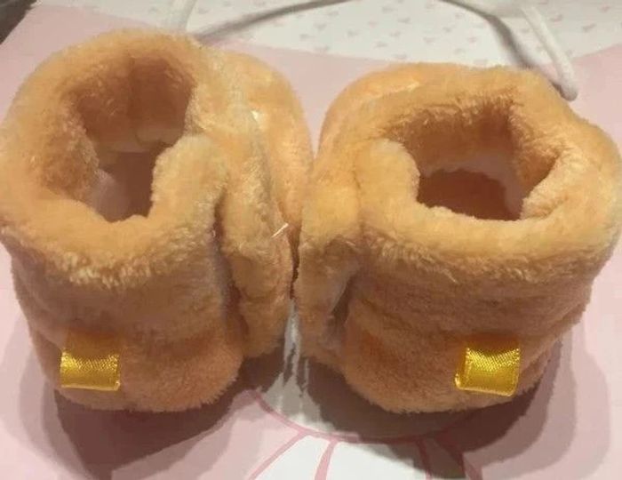 Chaussons polaire orange ou moutarde, « Bouille en or » longueur semelles 11 cm, pointure 20 - TBE