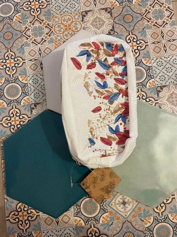 Pochette trousse à maquillage blanche imprimé feuilles multicolores, avec 2 compartiments
