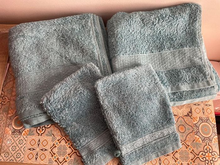 2 serviettes taille moyenne en coton + 2 gants de toilettes bleu clair
