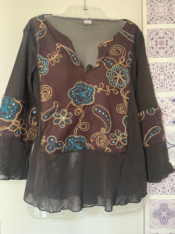 Tunique marron avec broderie thème floral beige et paillettes turquoise, manches évasées Dos en voile transparent marron