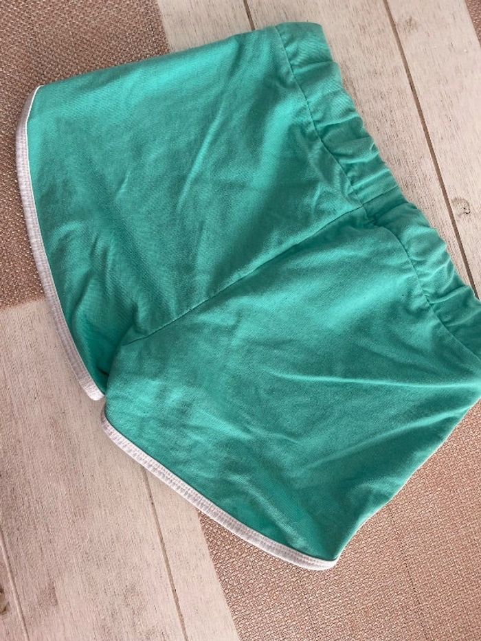 Short, vert, menthe, taille élastique. Petite auréole au bas du short, ainsi qu’une petite reprise au niveau du cordon pour éviter que celui-ci se perdent dans l’ourlet. Voir photo.