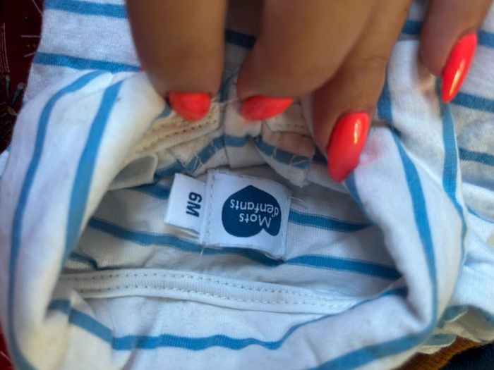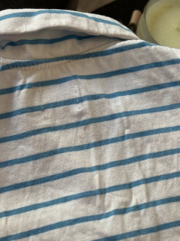 Tee shirt chemise bleu et blanche porté 1 fois très bon état légère tache à l’arrière mais ne gêne en rien taille 6 mois