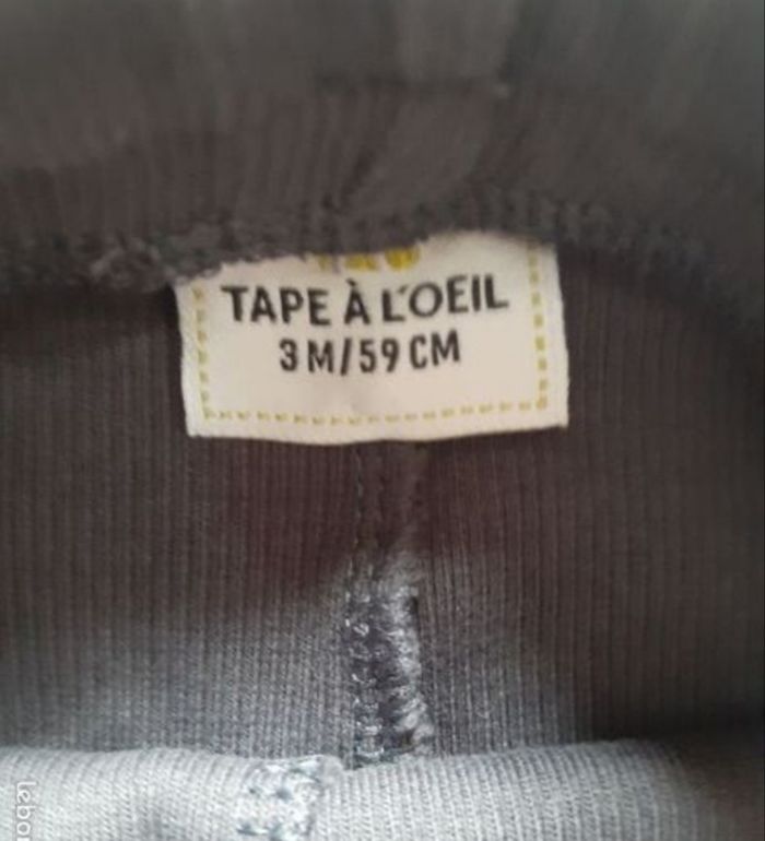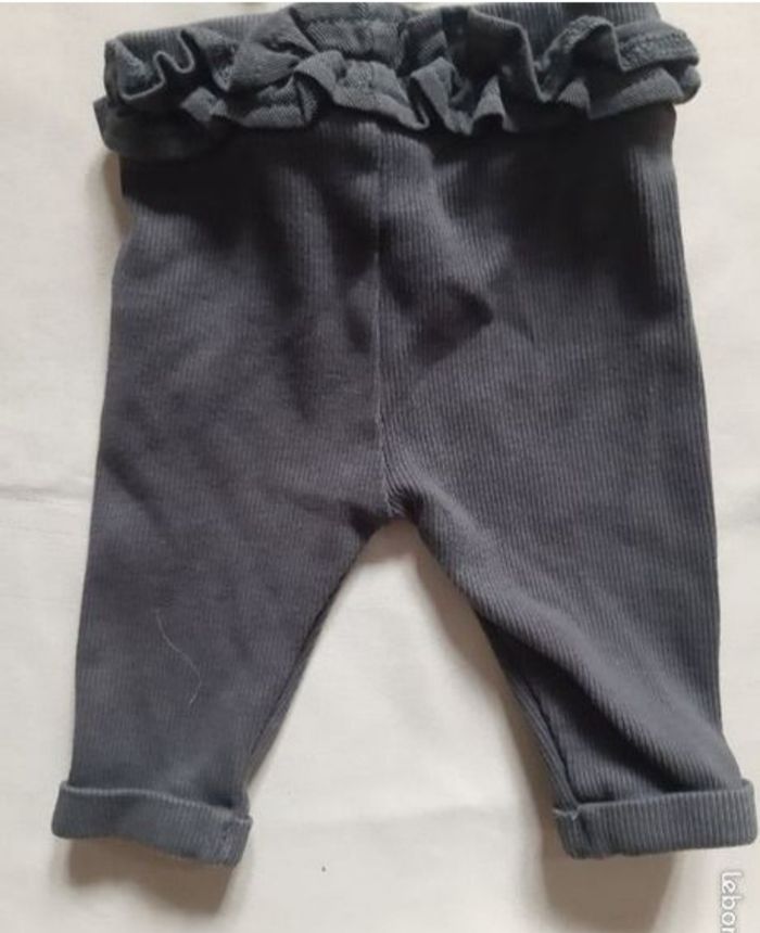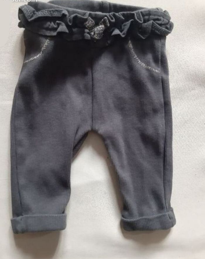 legging côtelé gris foncé, de la marque Tape à l'Œil, en taille 3 mois ceinture élastiquée avec de petits volants un petit nœud avec fils dorés au milieu état neuf, jamais porté