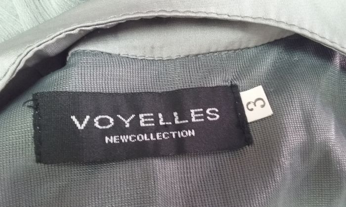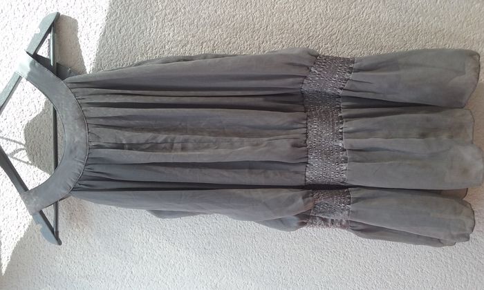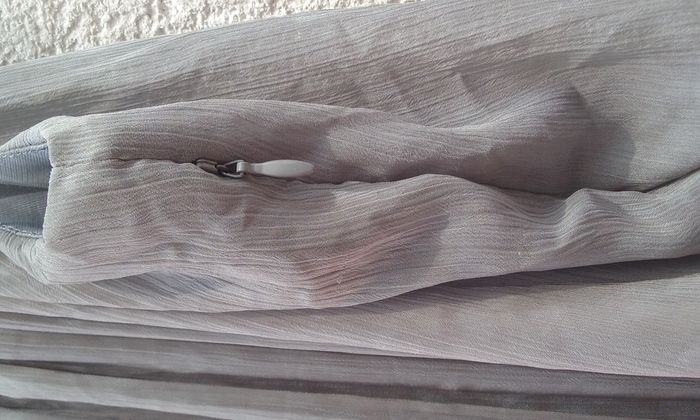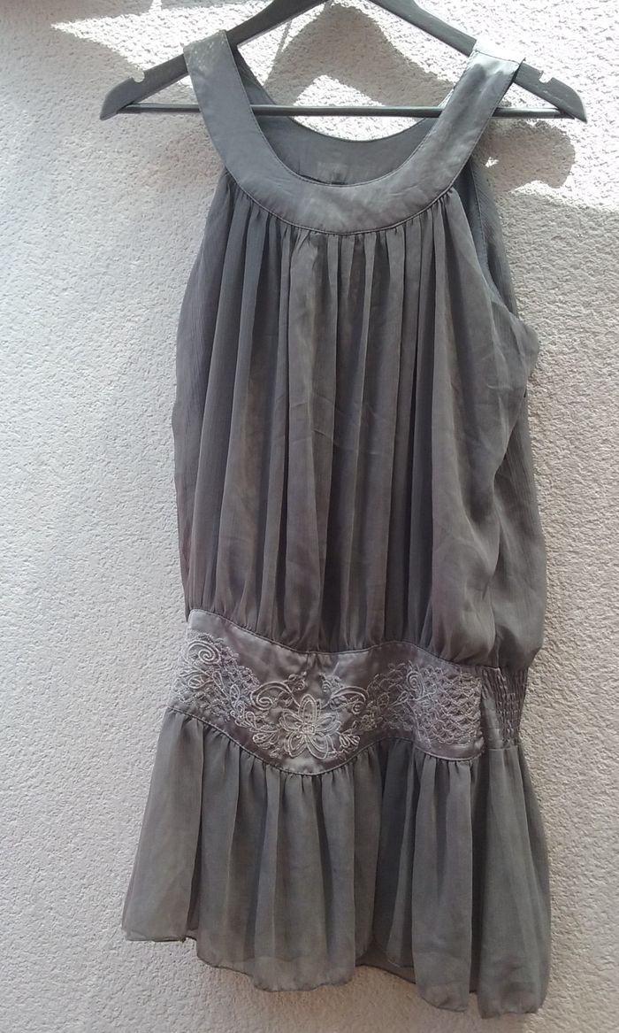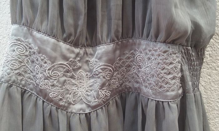 Tunique à l'aspect soyeux, ceinture froncée derrière et brodée devant, fermeture éclair sur le côté.