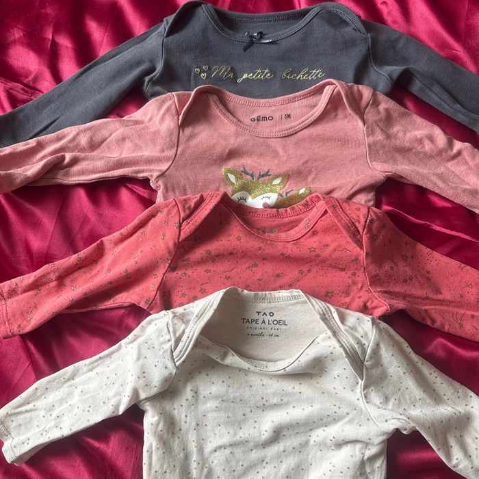 Lot de 4 bodies dont 3 en très bon état 2 Gemo + 2 Tape à l’œil 6 mois • manches longues #fahlyaechange #fahlyavetementbébé #bodiesfilles6mois