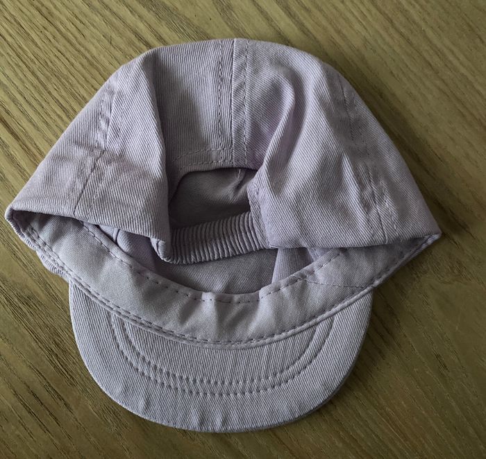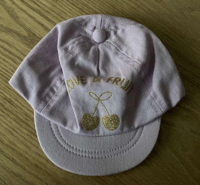 Casquette mauve en toile imprimé cerises dorées Taille : 41 cm correspond à 3 mois étiquette coupée