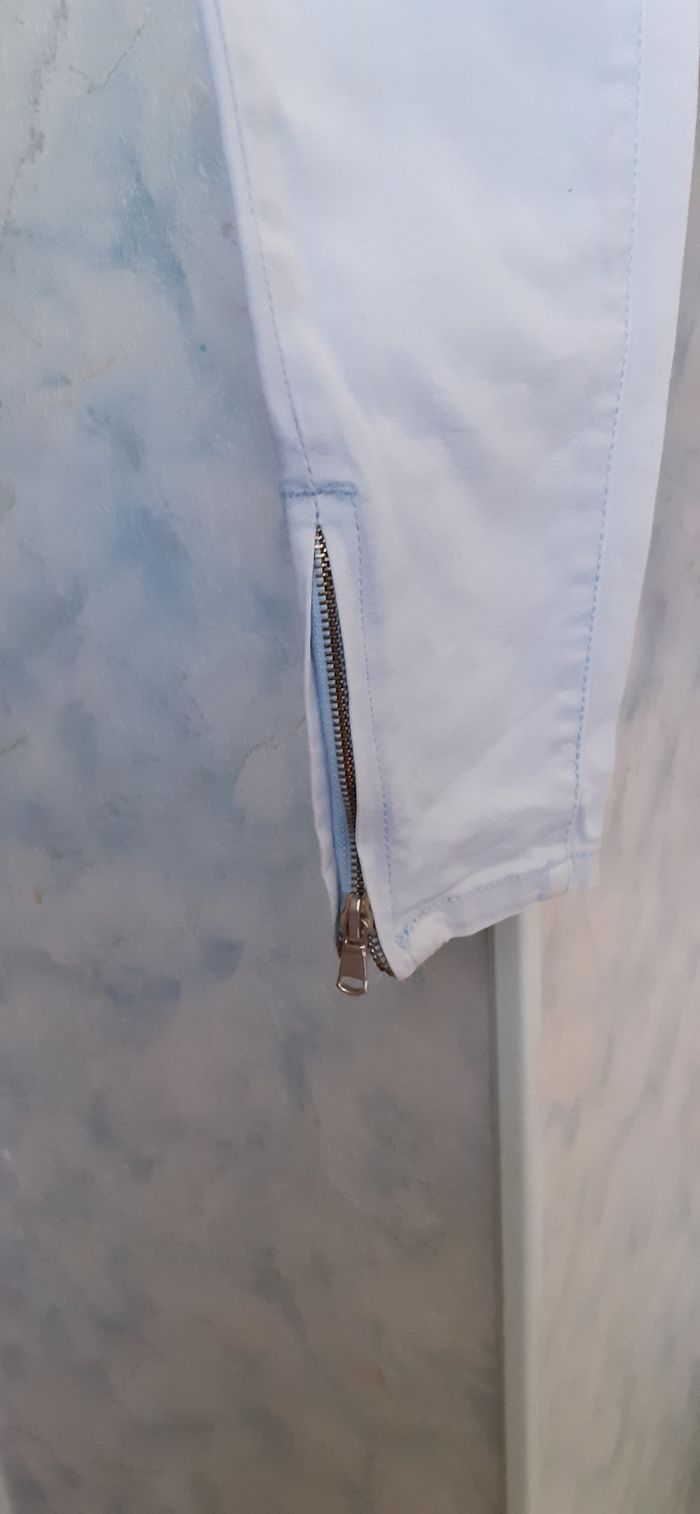 Vends un jean slim taille basse, couleur bleu ciel, fermeture éclair au bas des jambes, marque Avant Première, taille 34. Longueur entrejambe : 65 cm.