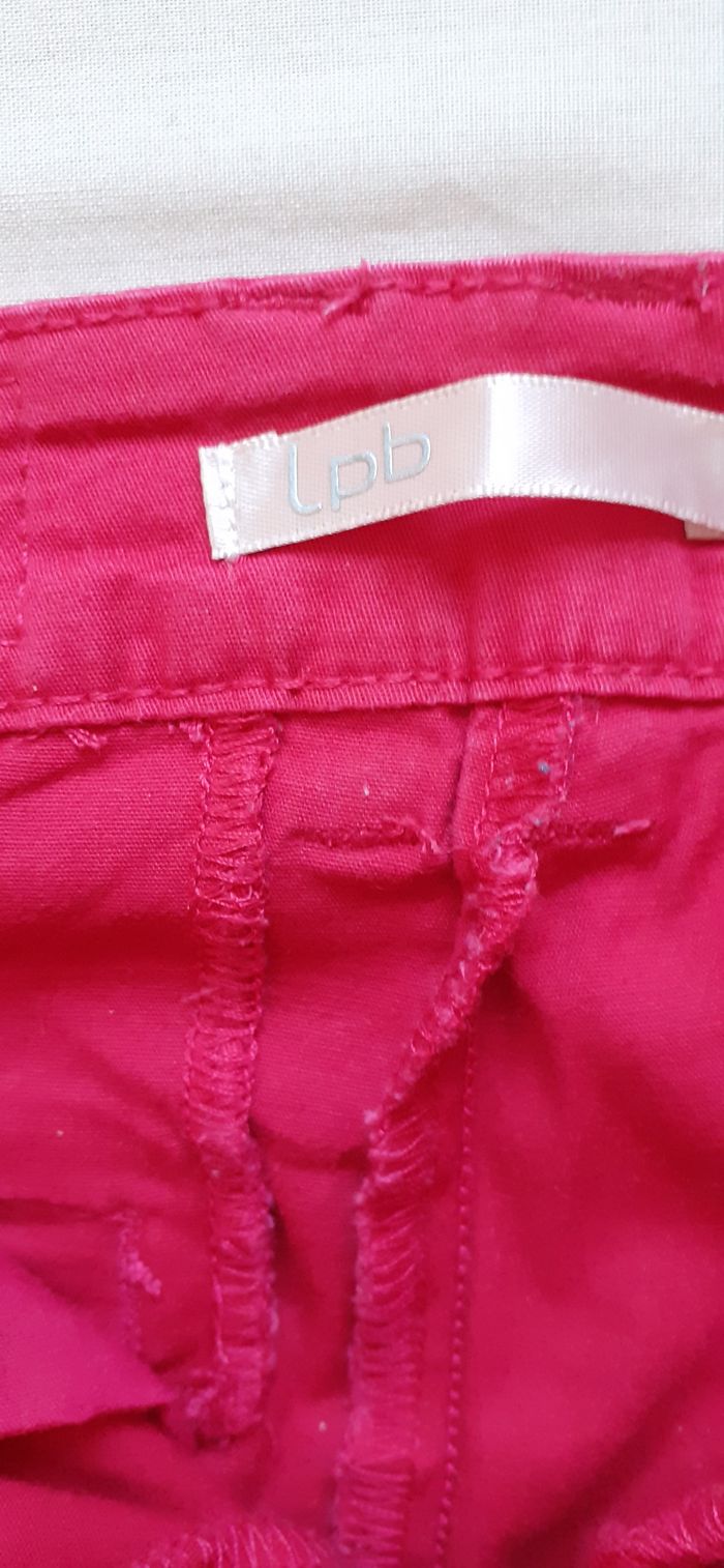 Vends un pantalon slim 98 % coton, 2 % élasthanne, 2 poches latérales, taille basse, couleur rouge uni, marque LPB Woman, taille 34. Longueur entrejambe : 73 cm.
