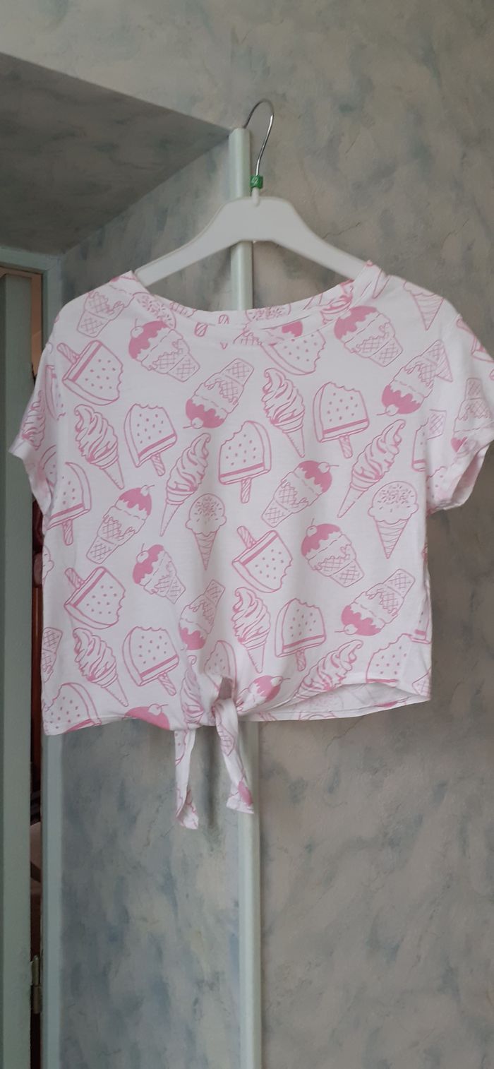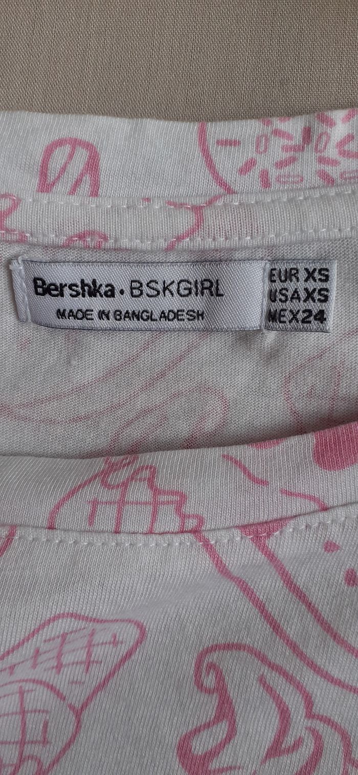 Vends un croc-top manches courtes, lien à nouer devant, 50 % coton, 50 % modal, couleur blanc avec motifs rose clair, marque Bershka, taille XS. Longueur : 39 cm.