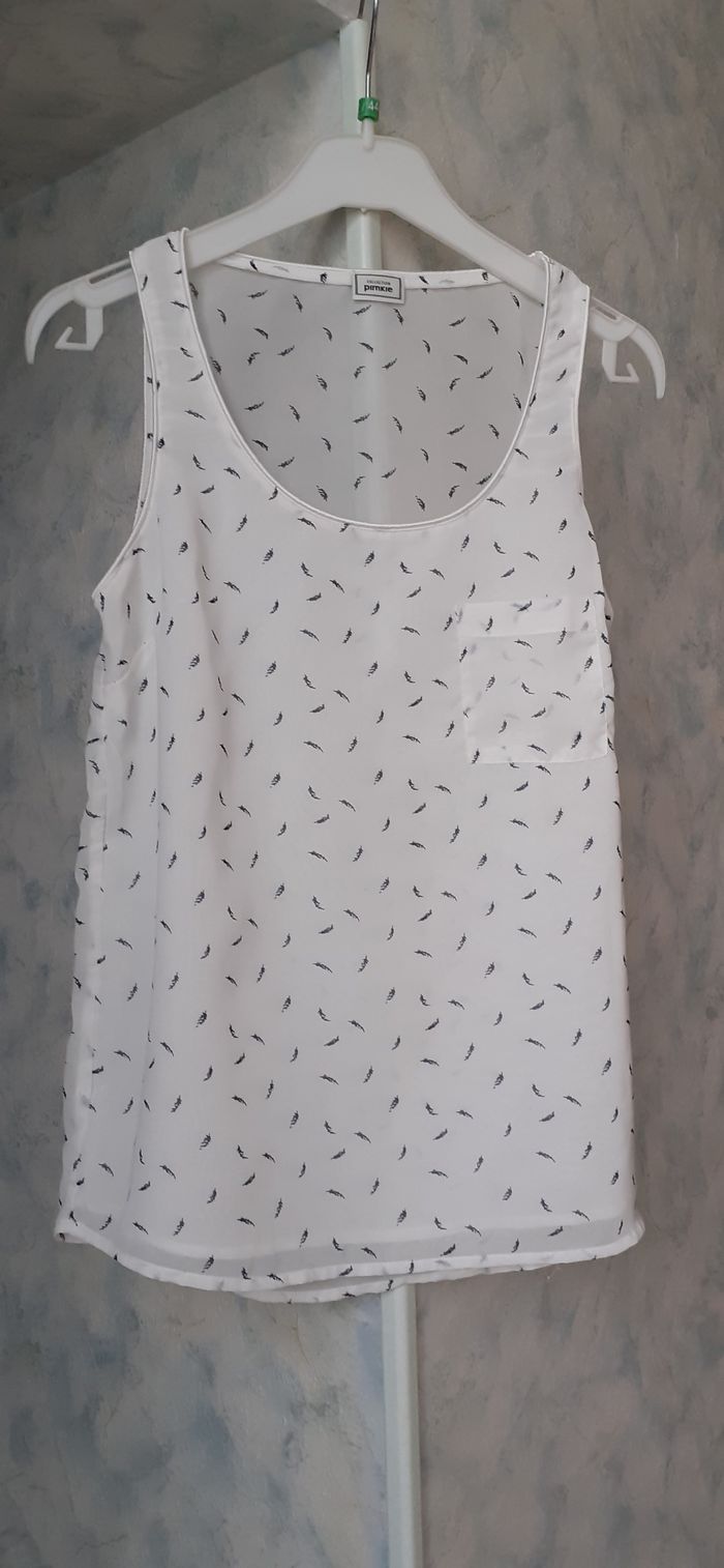 Vends un débardeur chic en voile, doublé devant, 100 % polyester, une petite poche, couleur blanc avec petites plumes noires, marque Pimkie, taille XS. Longueur : 60 cm.