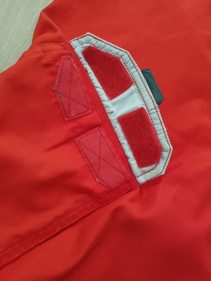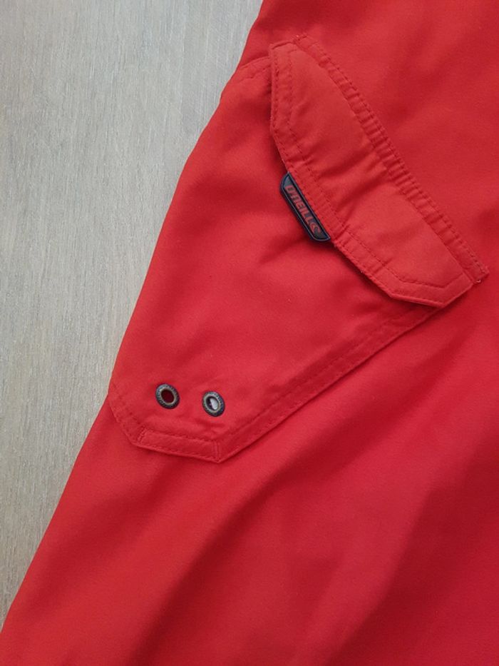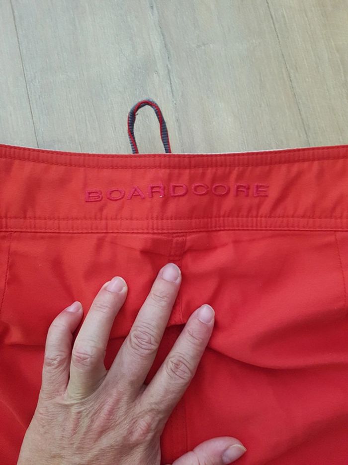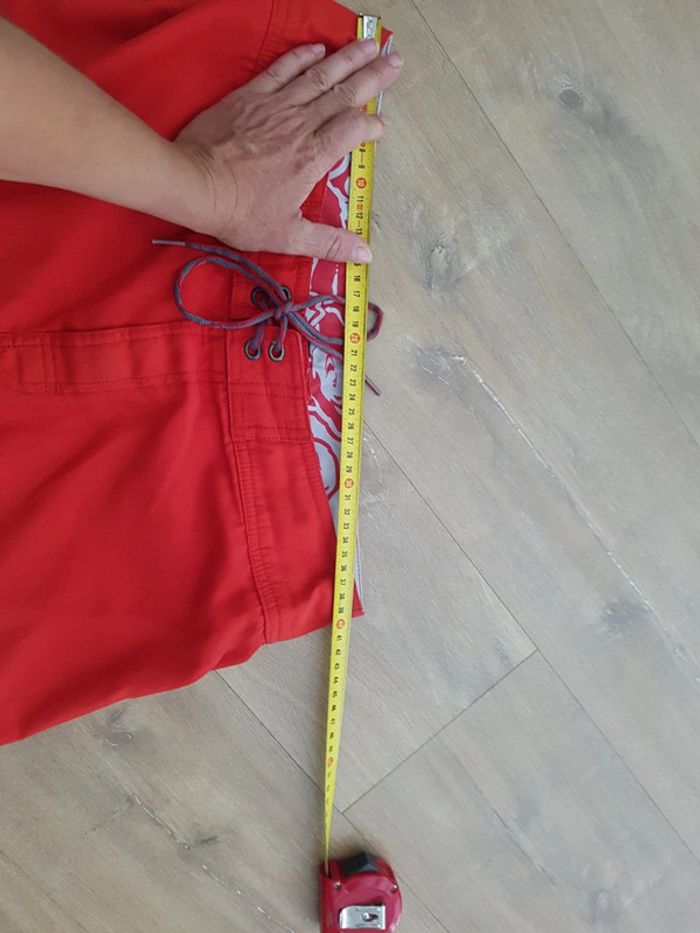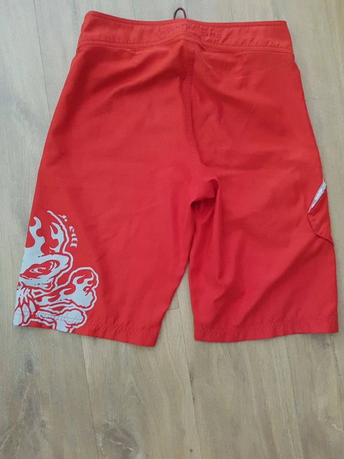 Short de bain long O'Neill, taille 32 (correspond à un 42) Rouge avec une tête de mort sur le bas de la jambe gauche, le dessin est un peu abîmé, voir photo