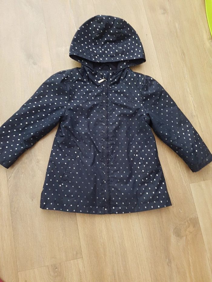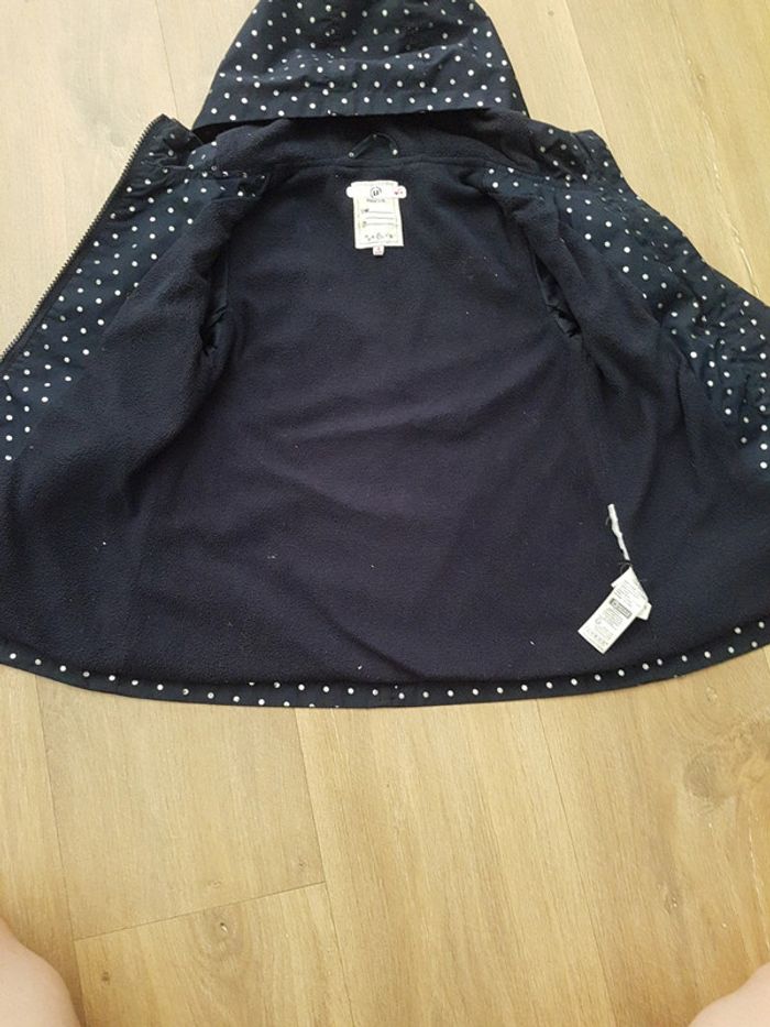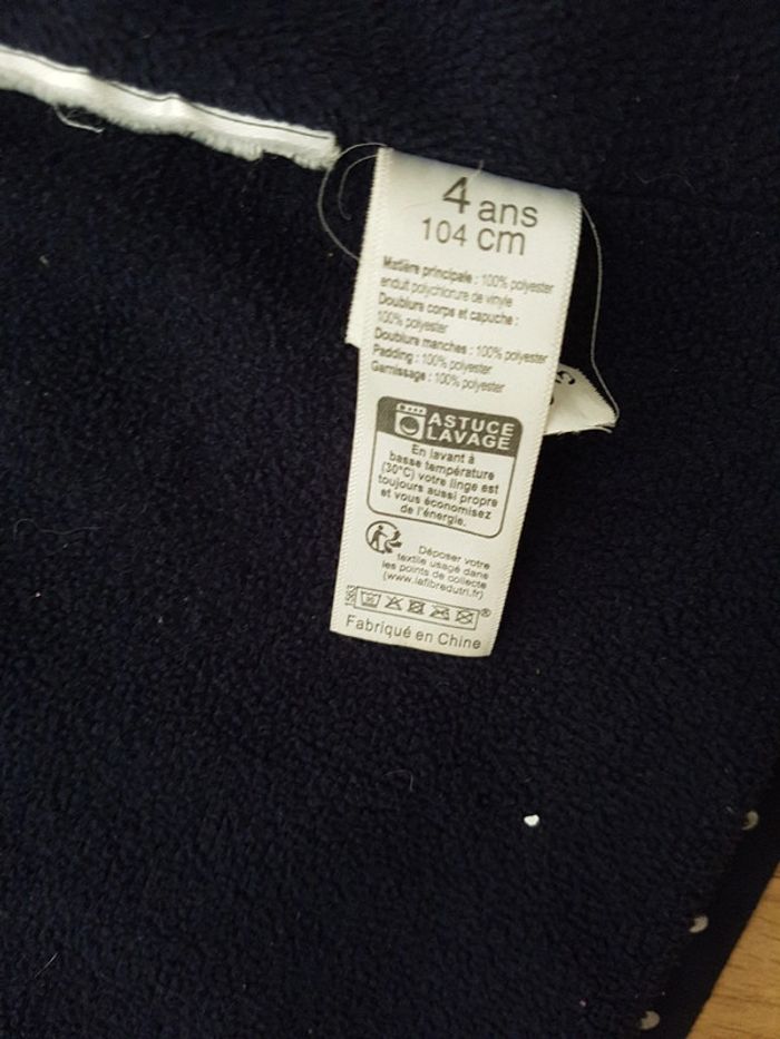 Veste de pluie U essentiel, taille 4 ans, doublure polaire (sauf manches doublure standard) Bleu marine avec des pois argentés (effacé à certains endroits)