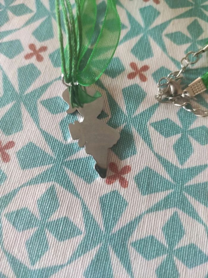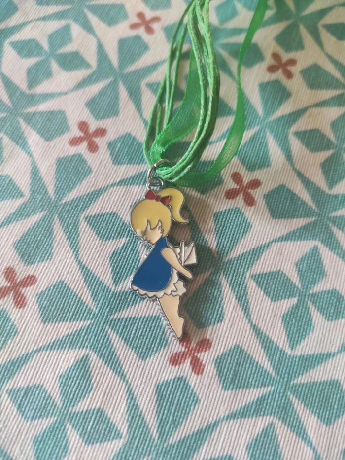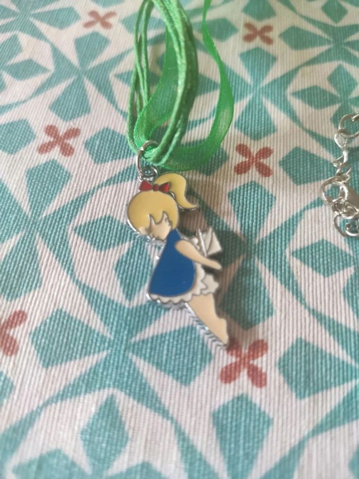 Collier neuf avec un pendentif en métal petite fille. Lien du collier en coton et organza #vulariBijoux