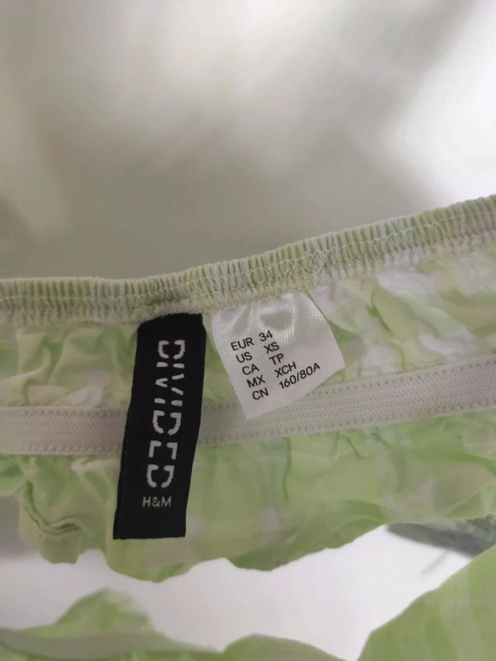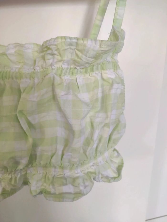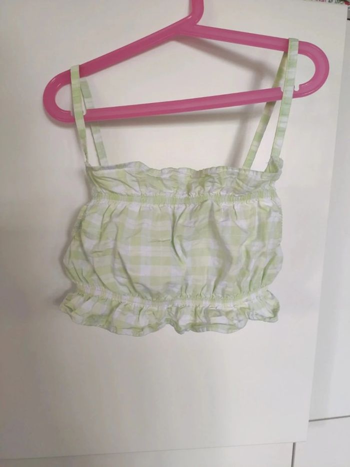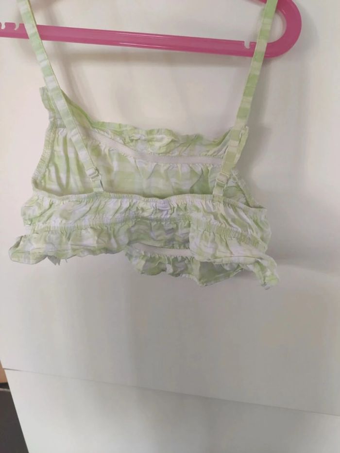 Brassière élastique avec froufrou en haut et en bas dans un imprimé à carreaux style Vichy couleur vert et blanc, bretelles réglables, dos dégagé, taille 34 XS. Collection divided de H&M. Très bon état car porté une ou deux fois #vulariFemmesXS34