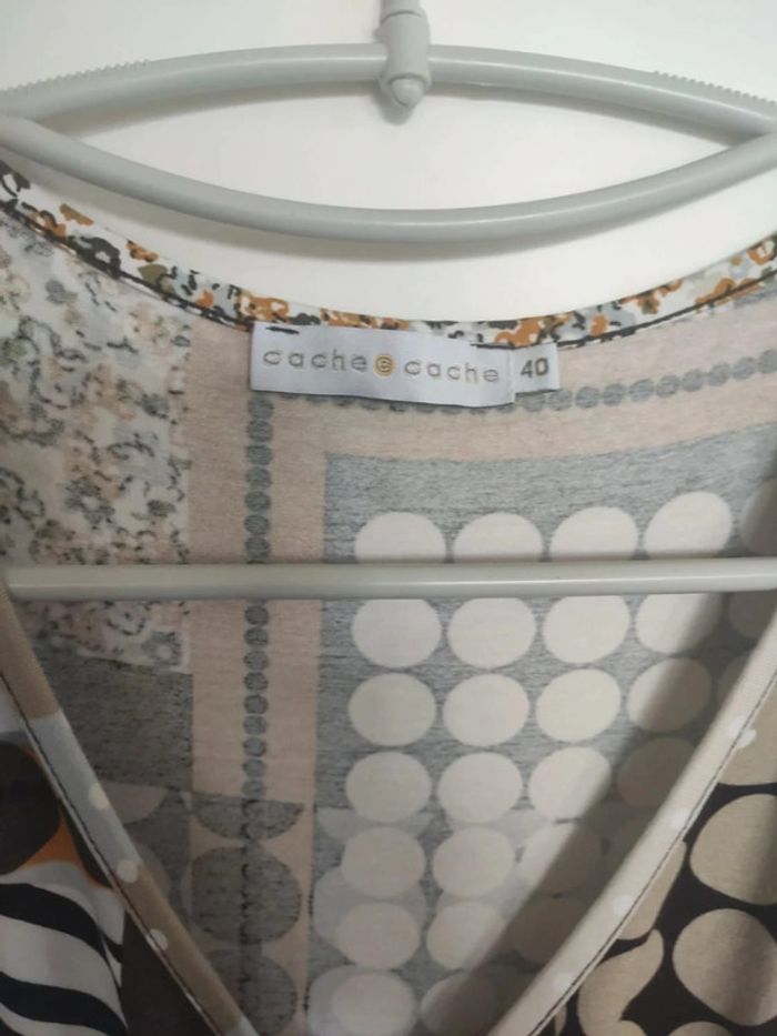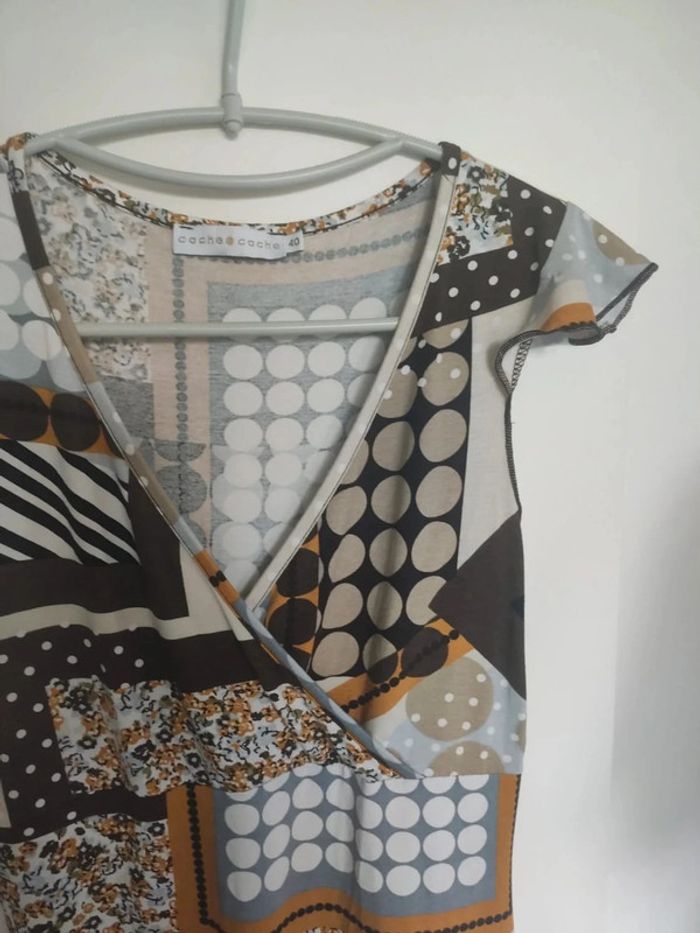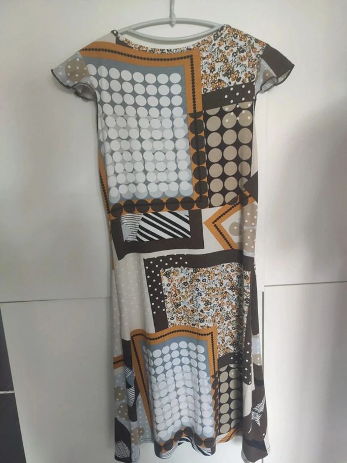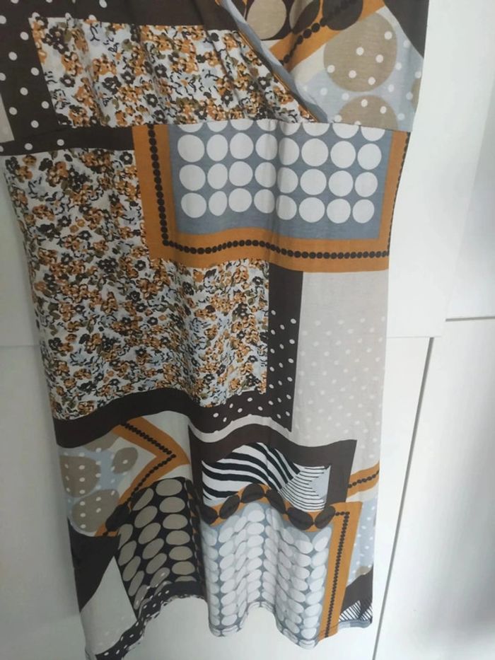 Robe à manches courtes avec un col croisé, style patchwork dans des dégradés de marron beige jaune moutarde. Bon état, taille 40, achetée Cache cache. Longueur totale 92 cm #vulariFemmesL40 #vulariCacheCache