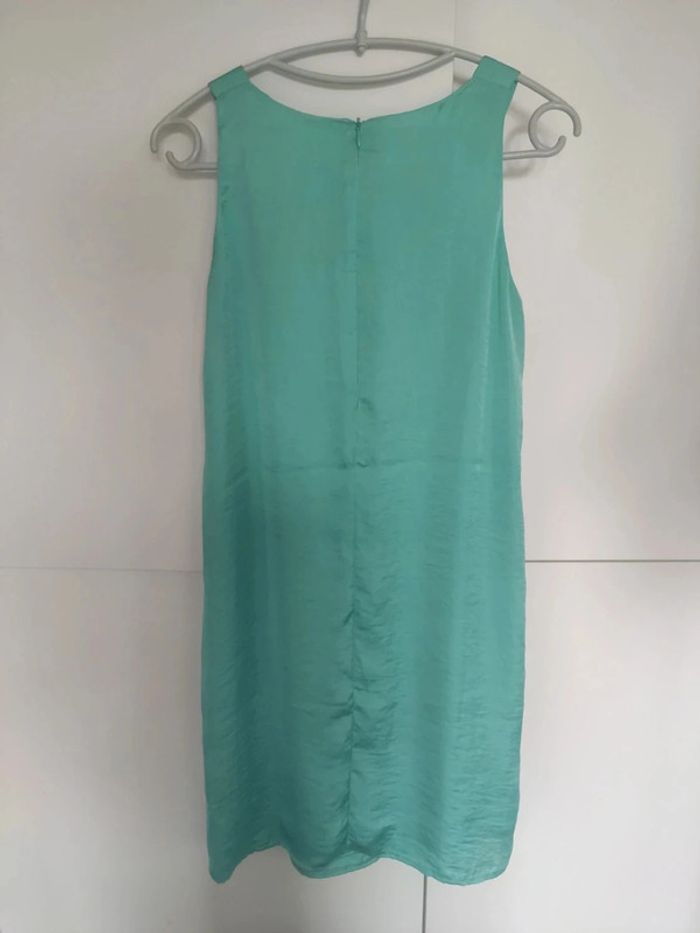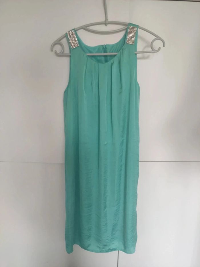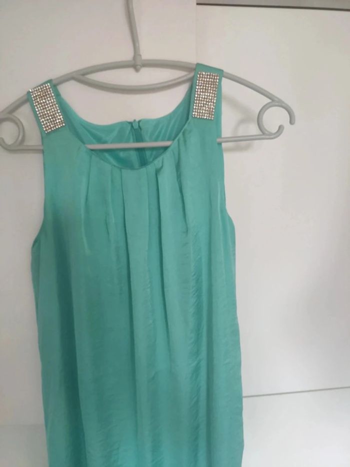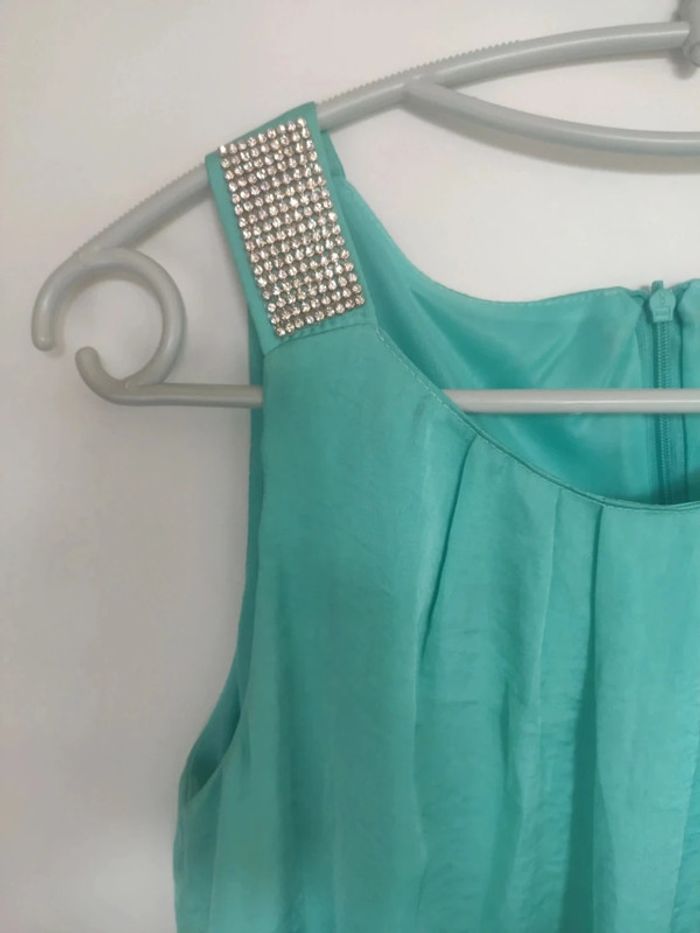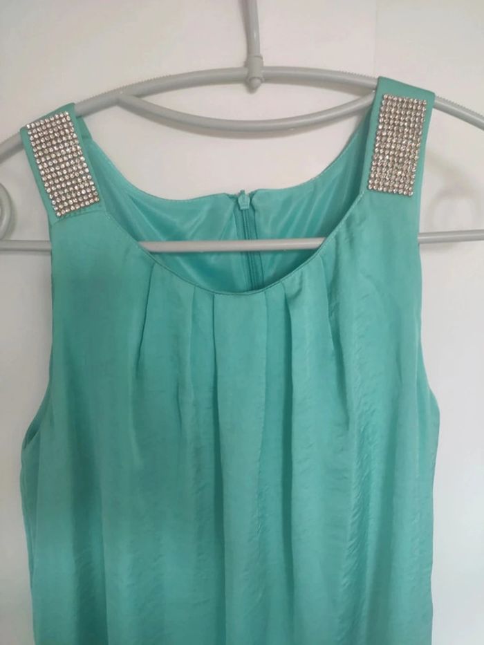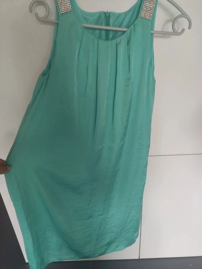 Robe tunique dans une matière légèrement irisée un tout petit peu plus vert que du turquoise, entièrement doublée, strass en haut de la robe, fermeture éclair au dos, très bon état, taille 38. Longueur totale 91 cm