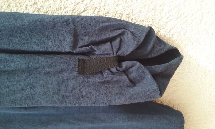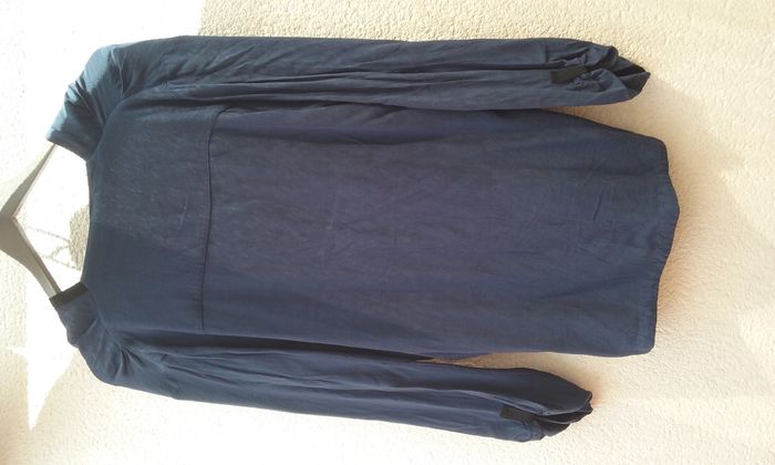 Blouse col V sans bouton, plus longue derrière que devant, petite fente sur les côtés, manches 3/4 retenues par une attache cousue, coloris bleu roi et noir, T38/40.