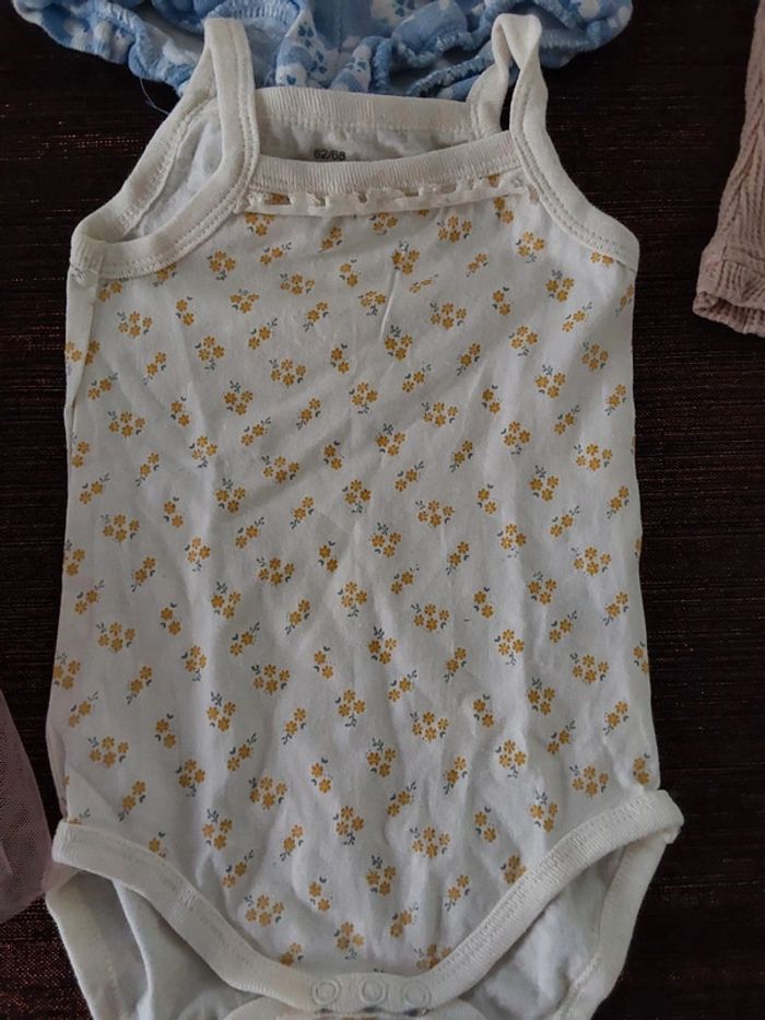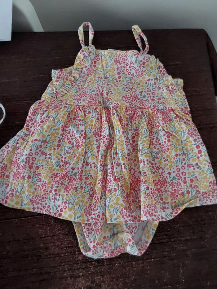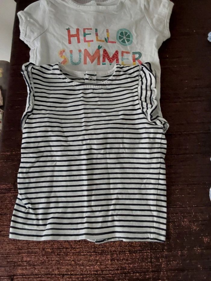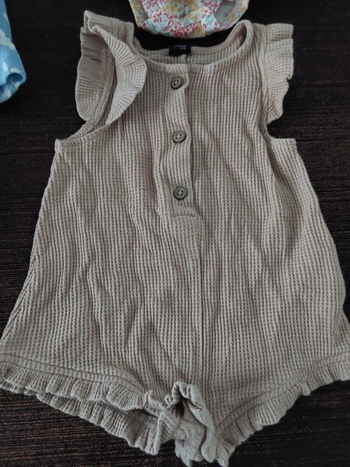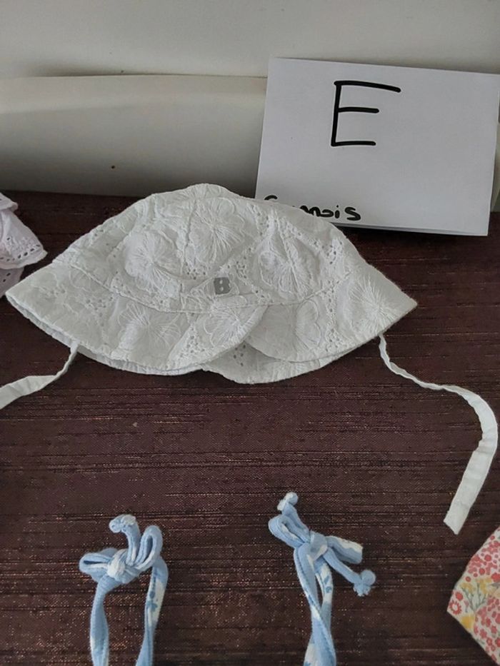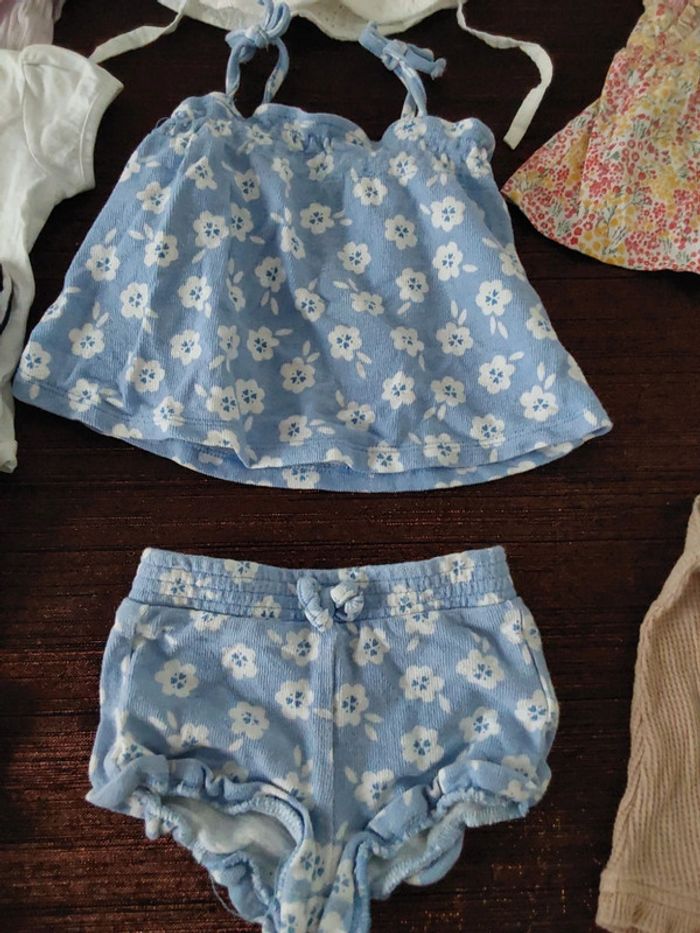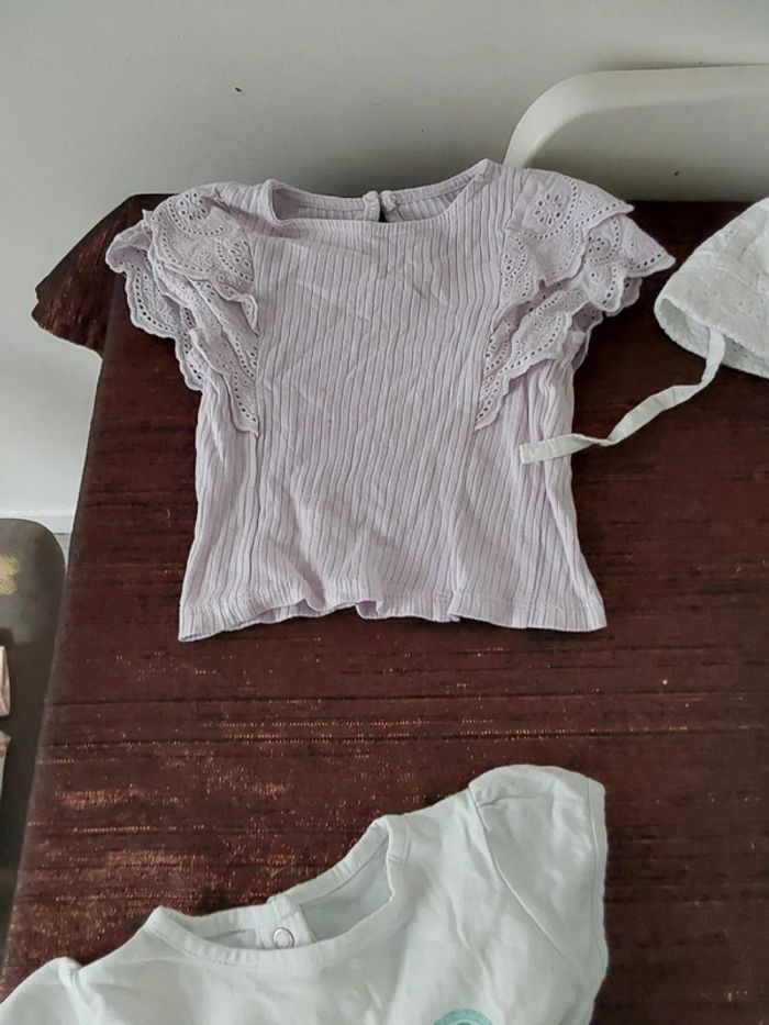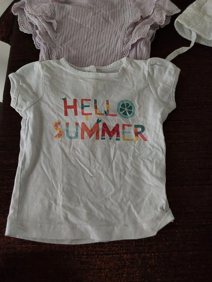 1 barboteuse, 2 robes bodies, 1 bodie débardeur, 1 ensemble short débardeur, 3 t.shirts manches courtes, 1 chapeau à ficelle