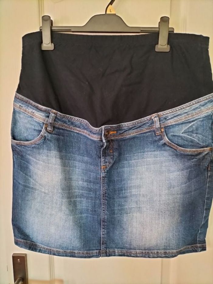 Jupe en jean avec bandeau bleu marine. 2 poches à l'avant et 2 à l'arrière. 96% coton 4% elasthanne