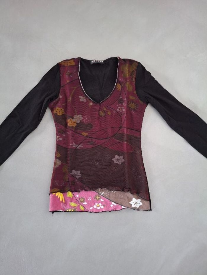 Haut manches longues habillé. Col V. Effet brillant. Très bon état.