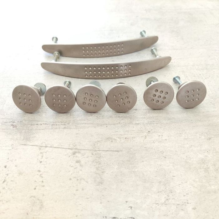 Lot de 2 poignées et 6 boutons de meuble en métal, avec visserie, couleur argent brossé, écart pour les poignées : 13 cm, longueur 16 cm, diamètre des boutons : 3 cm