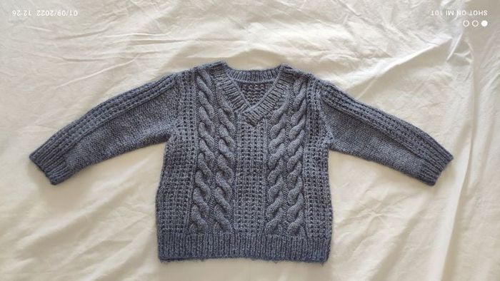 pull tricoté à la main laine BdeF - 60% acrylique et 40% polyamide - chaud pour l'hiver - couleur bleu jean (les photos ne reflètent pas réellement la couleur) - dimensions : du haut de col jusqu'en bas : 42 cm - dessous de bras jusqu'en bas : 24 cm - longueur de manche emmanchure jusqu'au poignet : 24 cm - largeur : 36 cm - 4 ans - en bon état