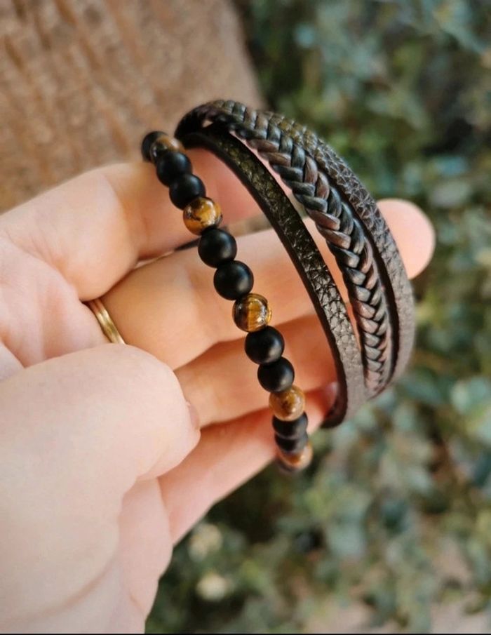 A12 bracelet jonc cuir marron œil de tigre fermoir magnétique - photo numéro 2