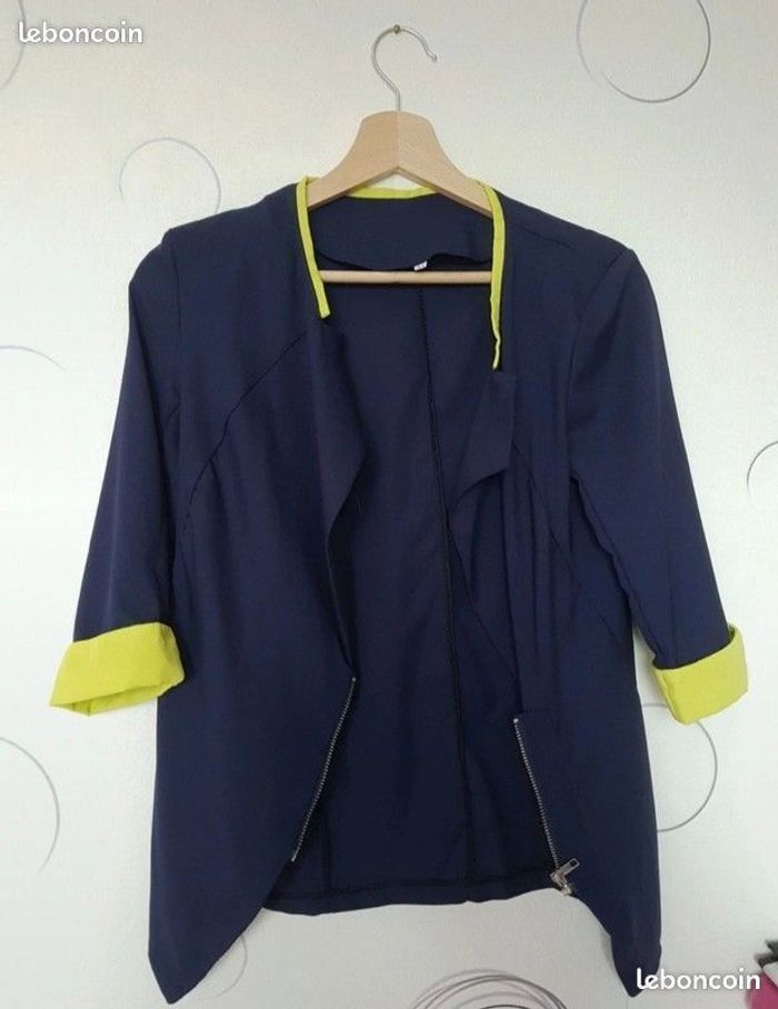 Veste souple/légère avec manche mi-long (3/4) Couleurs bleu avec le col et le bout des manches jaune/ vert fluo Pour femme Taille M En très bon état (porté juste 2-3 fois)