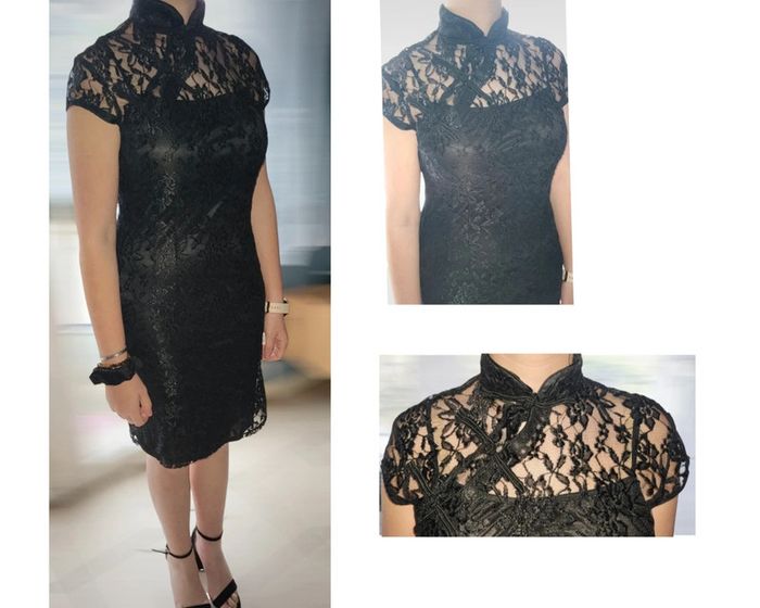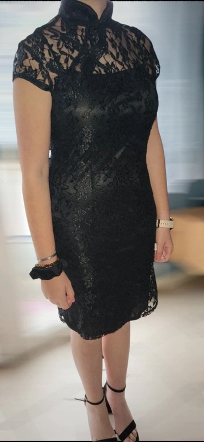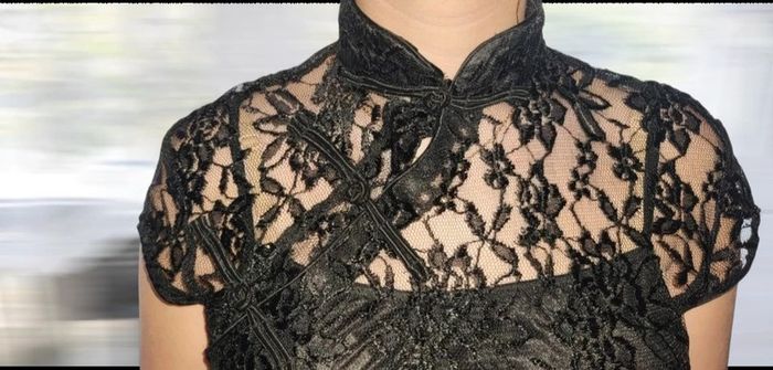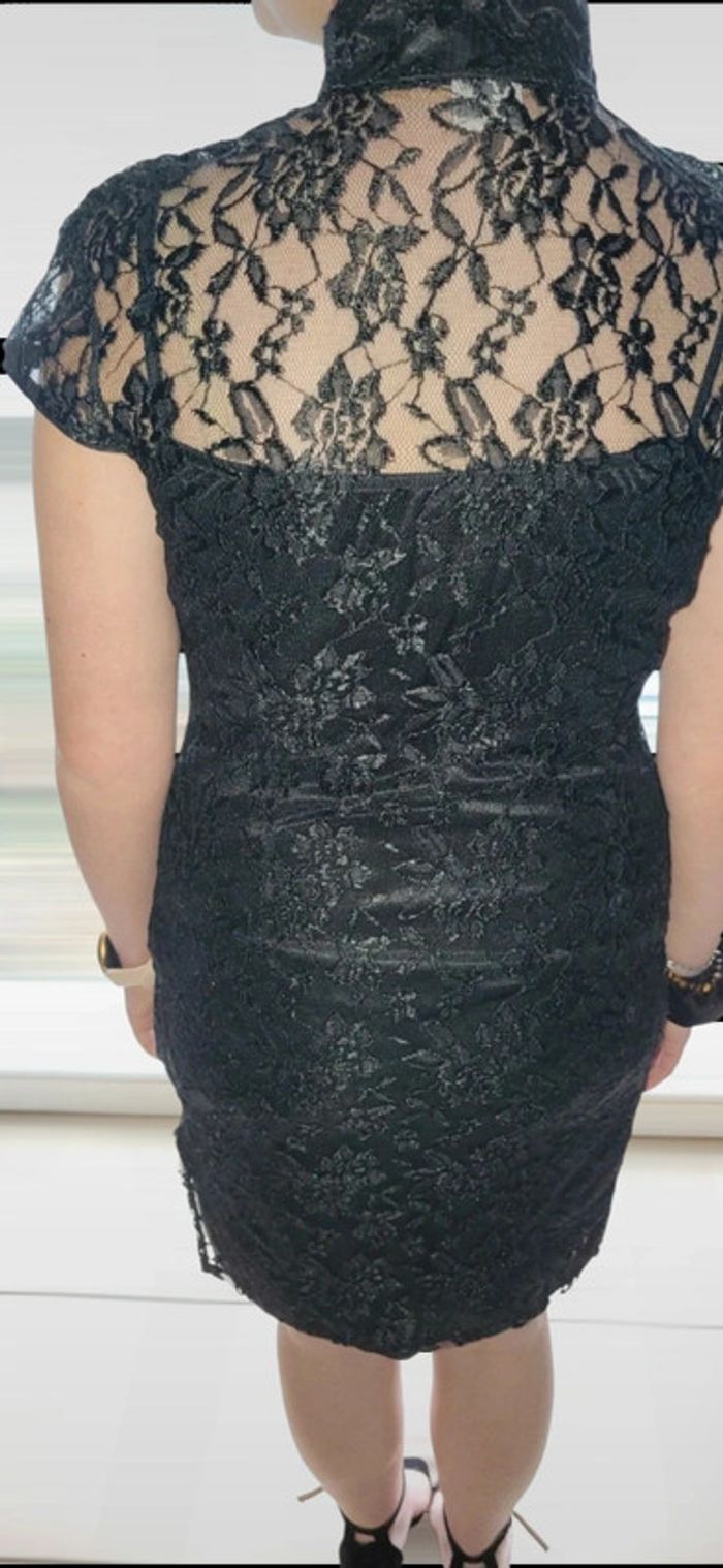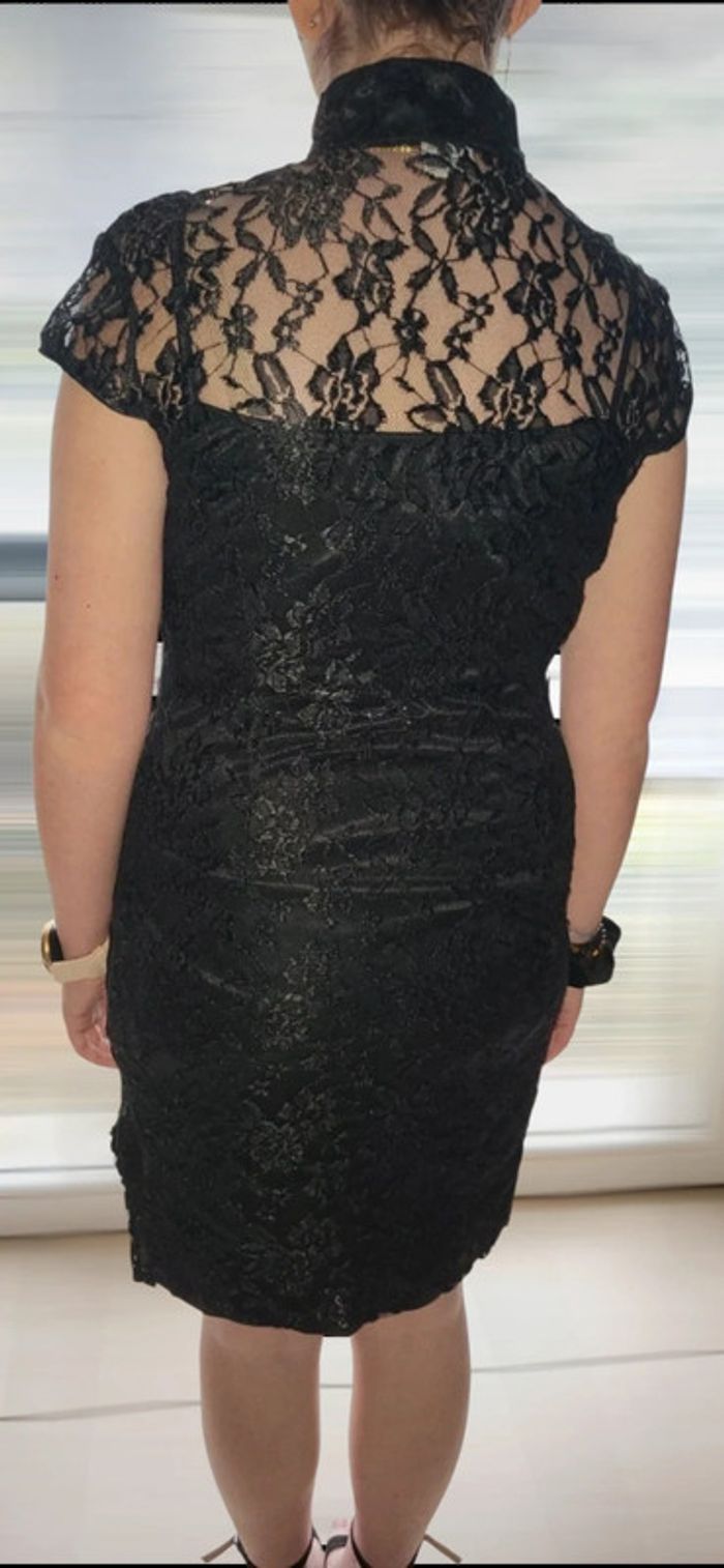 Magnifique robe noire en dentelle avec col montant style oriental. Détail transparent en haut pour une touche chic et féminine.