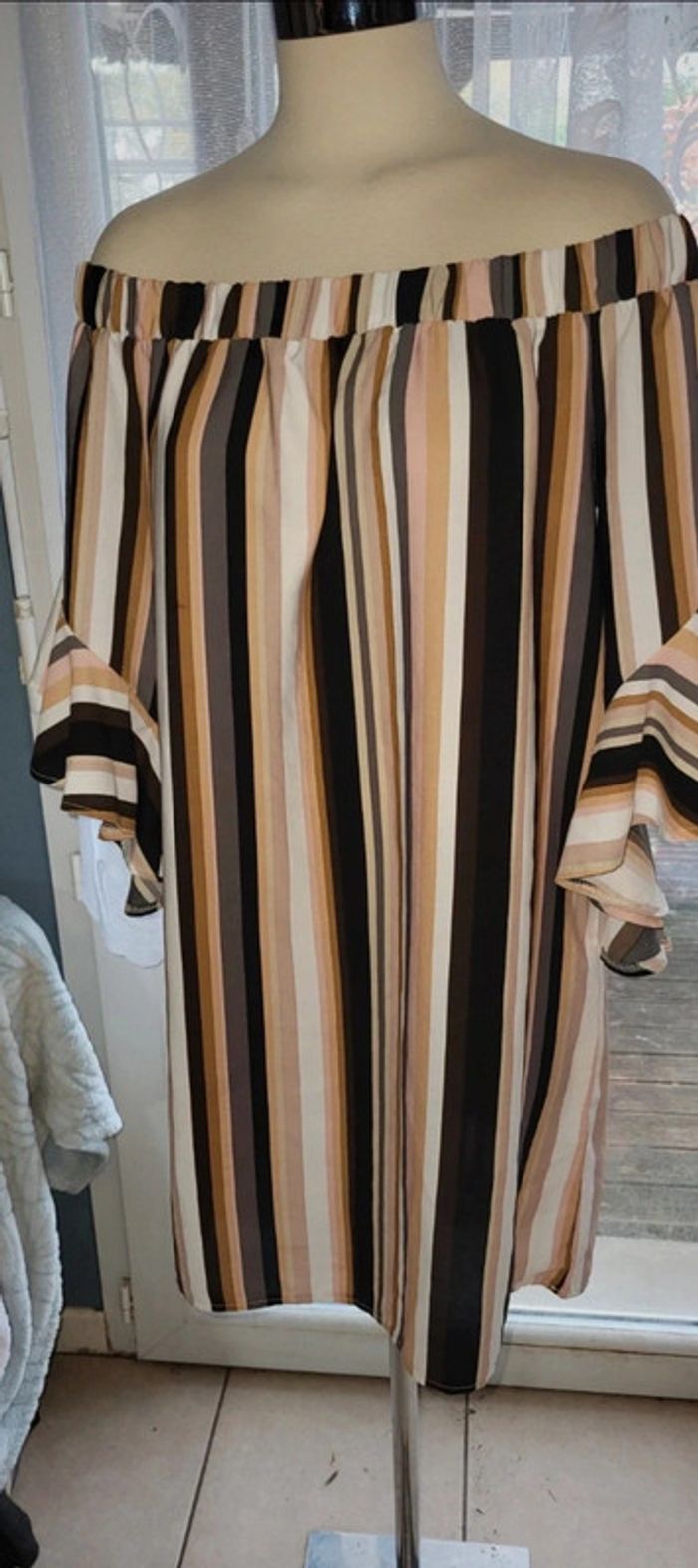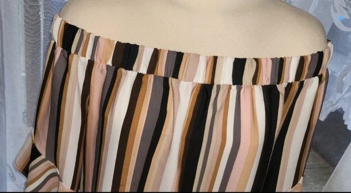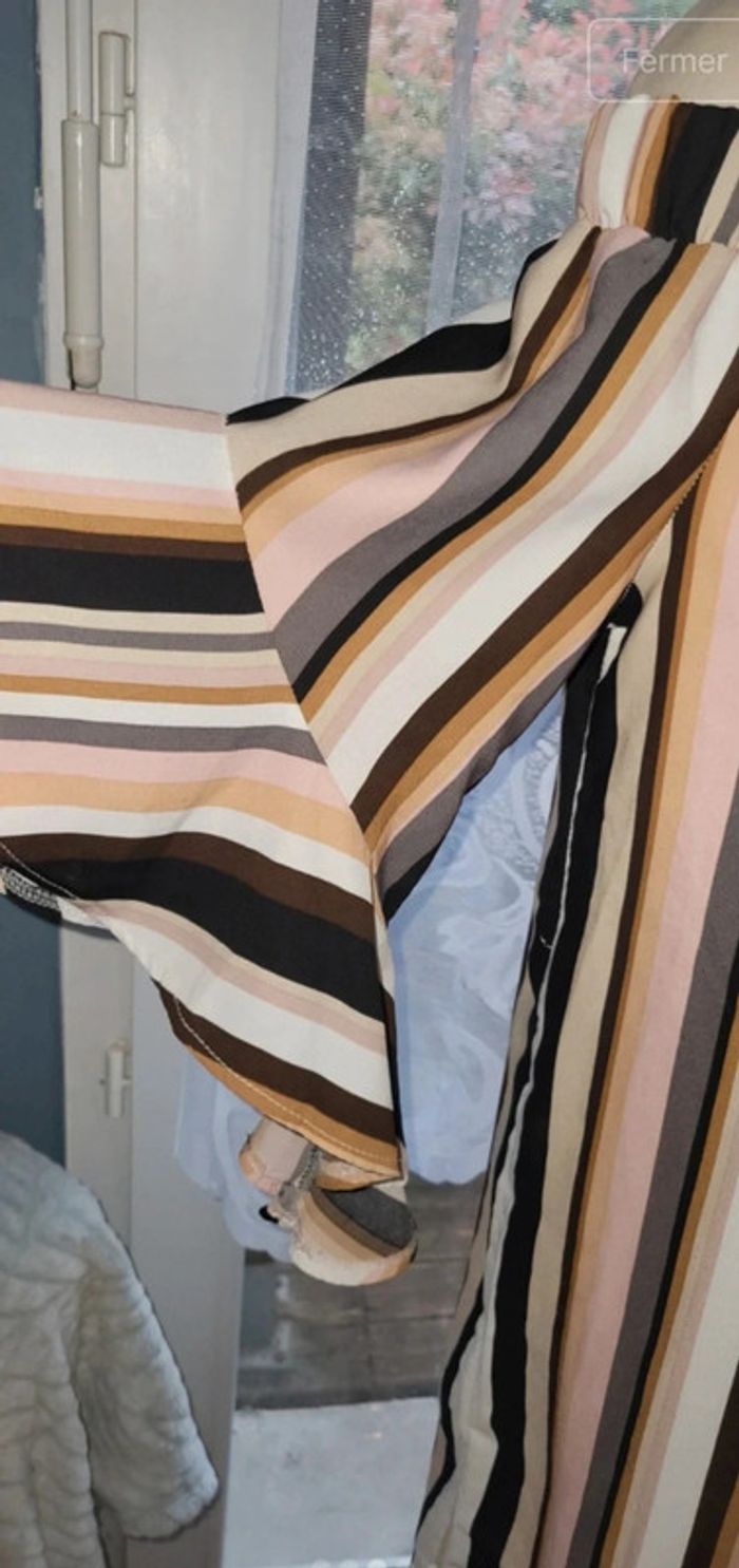 ✨ Taille : 44 ✨ État : Très bon état ✨ Caractéristiques : Motif rayé aux tons noirs, bruns, beiges, blancs et roses, avec manches courtes à volants Cette robe est parfaite pour une tenue estivale ou un look décontracté chic ! Sa coupe fluide et ses épaules dénudées ajoutent une touche de féminité à votre garde-robe. 🌸 **Contactez-moi pour plus d'infos ou pour ajouter ce superbe haut à votre collection !** Marque cache cache #a2life_taille44
