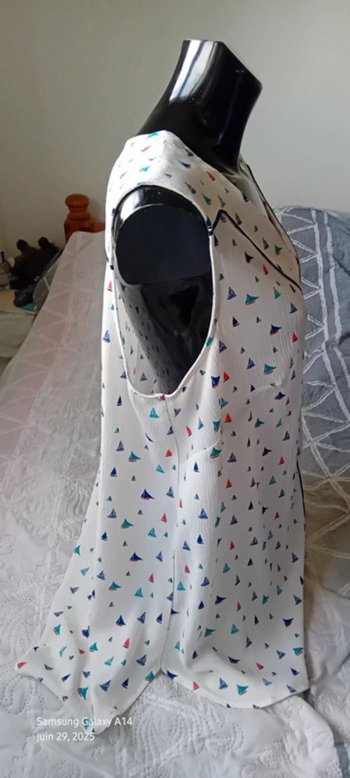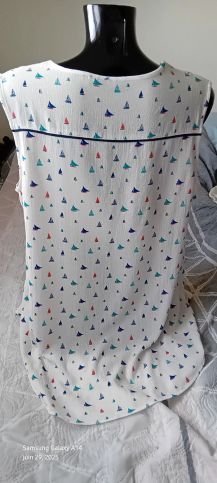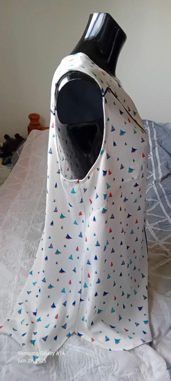 Blouse longue sans manches en polyester aspect crêpe un peu plissé matière fluide légère semitransparente plastron devant motif bateaux vert rouge et bleu sur fond blanc plus court devant que derrière longueur 73 cm devant 82 cm derrière largeur aisselles à aisselles 55 cm taille 46 très peu portée en très bon état #midole #midolefemme #midolefemme46 #femme46 #blousefemme46 #blousesansmanches46 #blouselegere #blouseimprimée #motifbateaux #blousedebardeur46 #kiabi