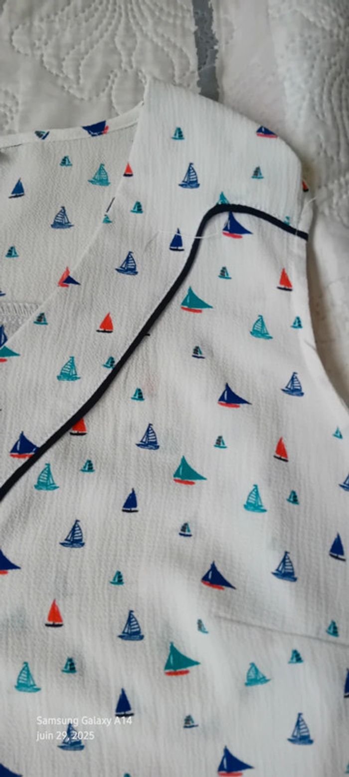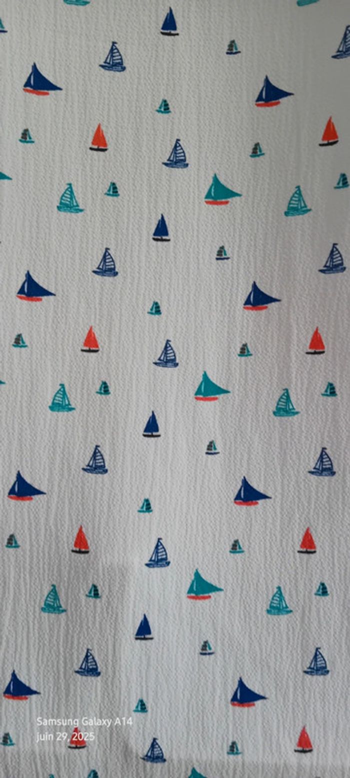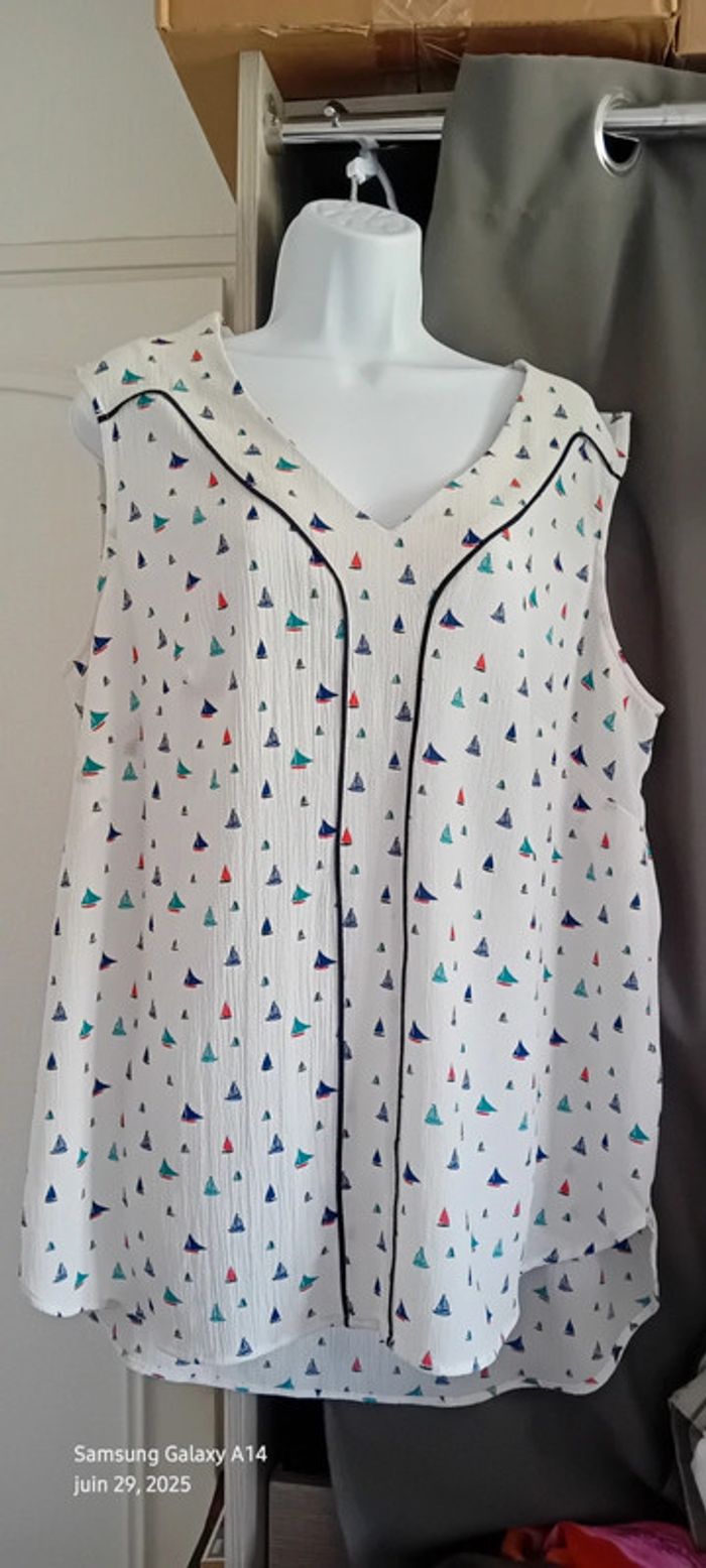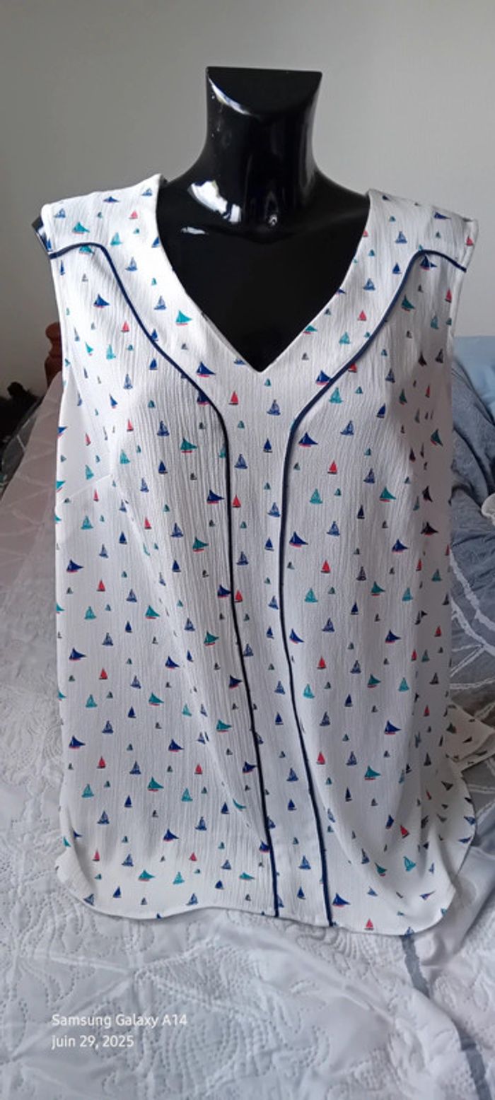Blouse longue sans manches en polyester aspect crêpe un peu plissé matière fluide légère semitransparente plastron devant motif bateaux vert rouge et bleu sur fond blanc plus court devant que derrière longueur 73 cm devant 82 cm derrière largeur aisselles à aisselles 55 cm taille 46 très peu portée en très bon état #midole #midolefemme #midolefemme46 #femme46 #blousefemme46 #blousesansmanches46 #blouselegere #blouseimprimée #motifbateaux #blousedebardeur46 #kiabi