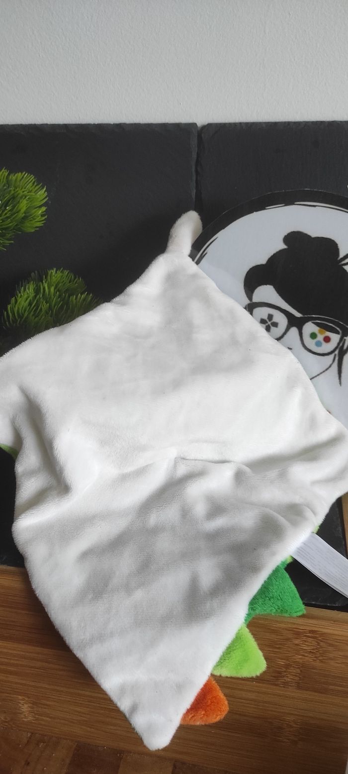 Doudou plat dinosaure dragon vert blanc orange Simba toys Kiabi Carré Nicotoy