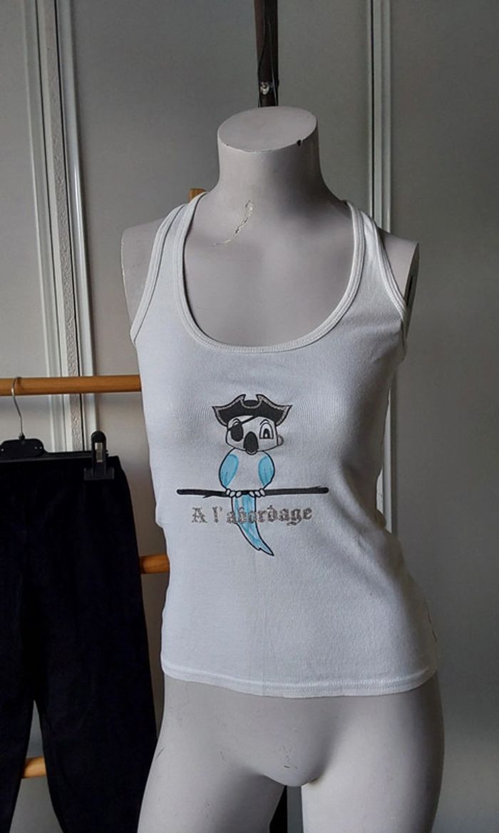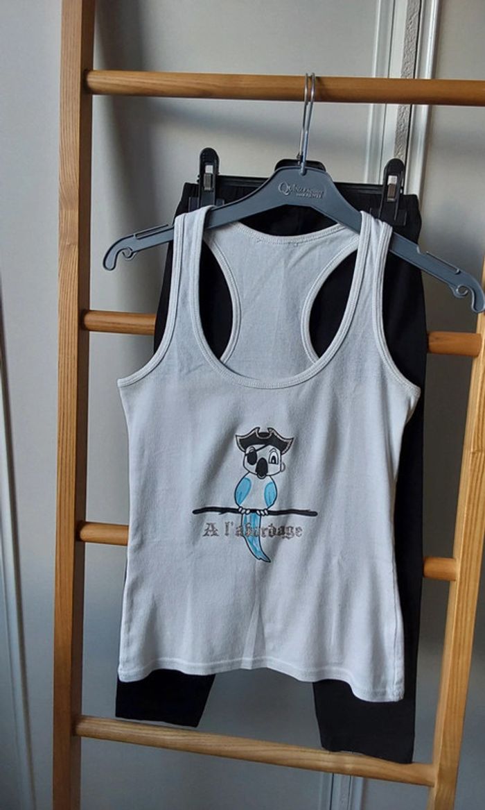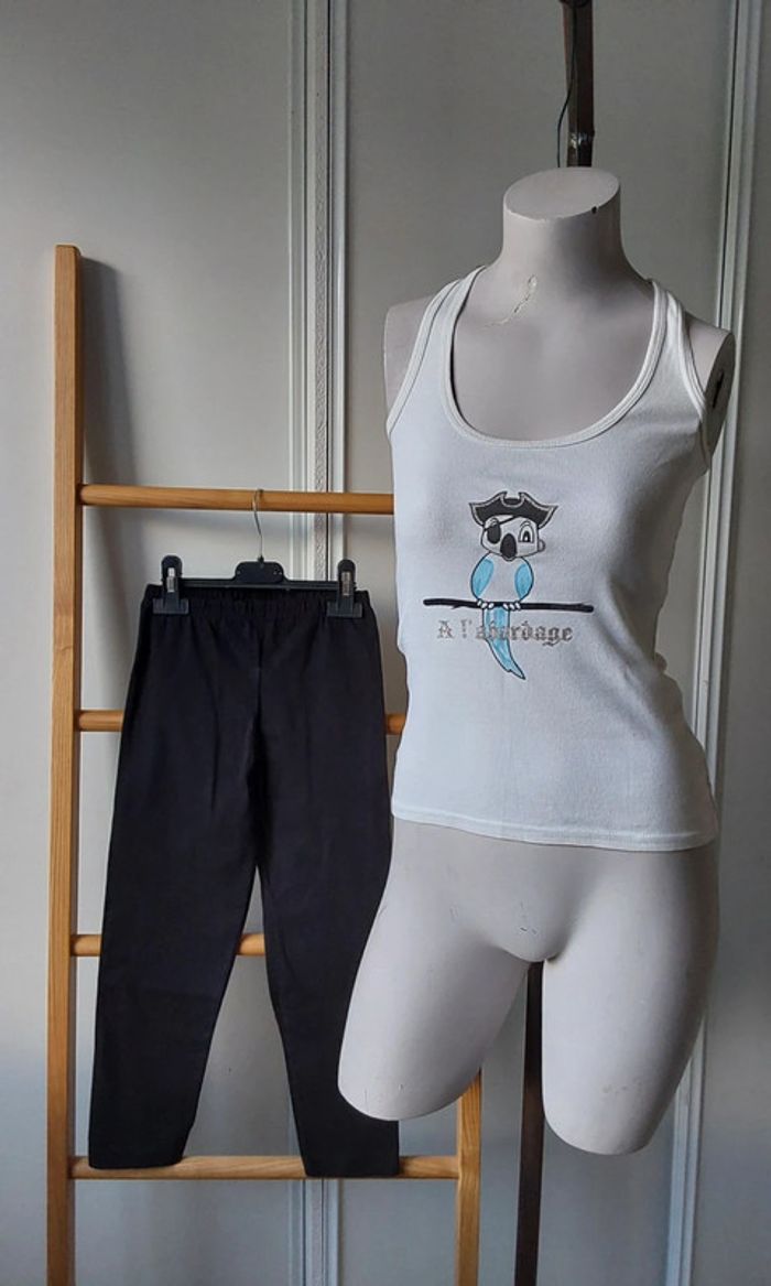 Ensemble rigolot perroquet pirate corsaire T 36 Débardeur en coton avec un motif perroquet pirate noir bleu et pailletés argenté. Aisselles à aisselles 32/34 cm environ(extensible...) Longueur 56 cm Et pantalon leggings corsaire taille élastique et Longueur 69 cm Coton /Polyester/élasthane Pour la suite de mes vêtements en T36... #legrenierdeprovence36 #pirate #perroquet