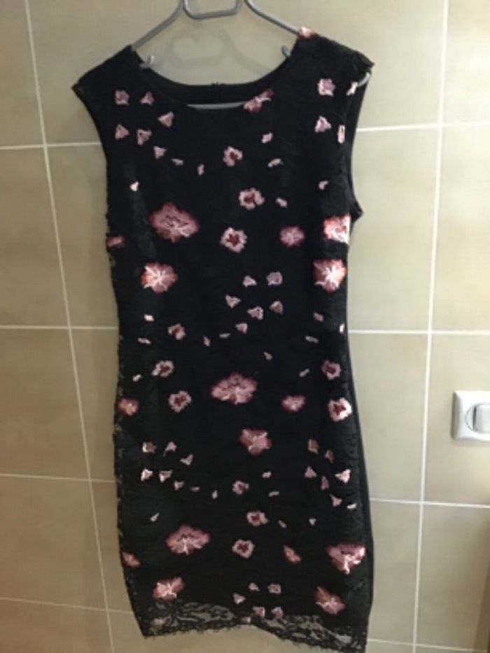 Robe noire en dentelle fleurs roses foncé et rose clair dos uni noir. La robe est doublée