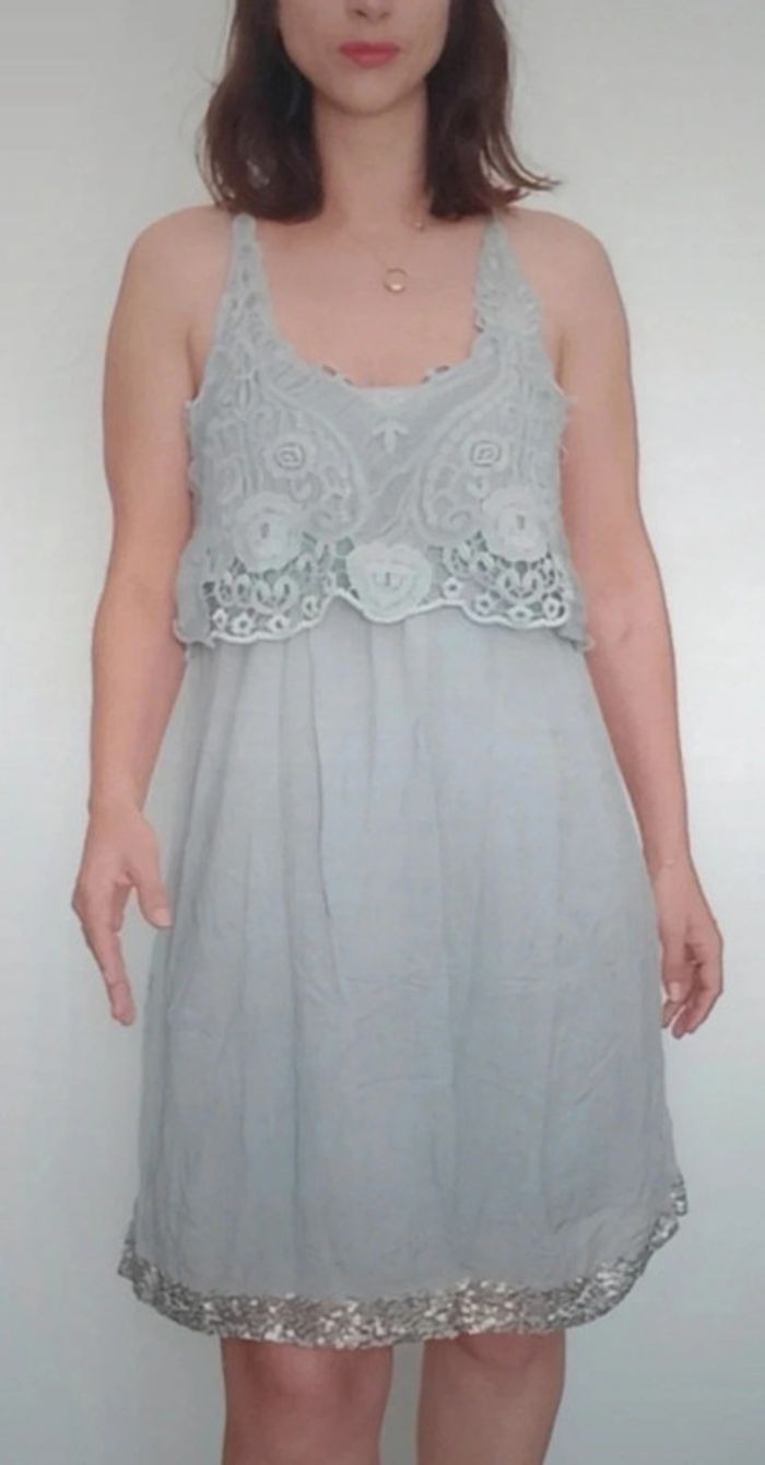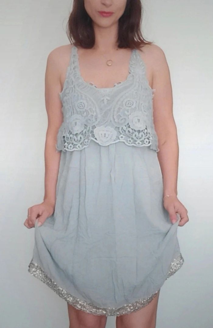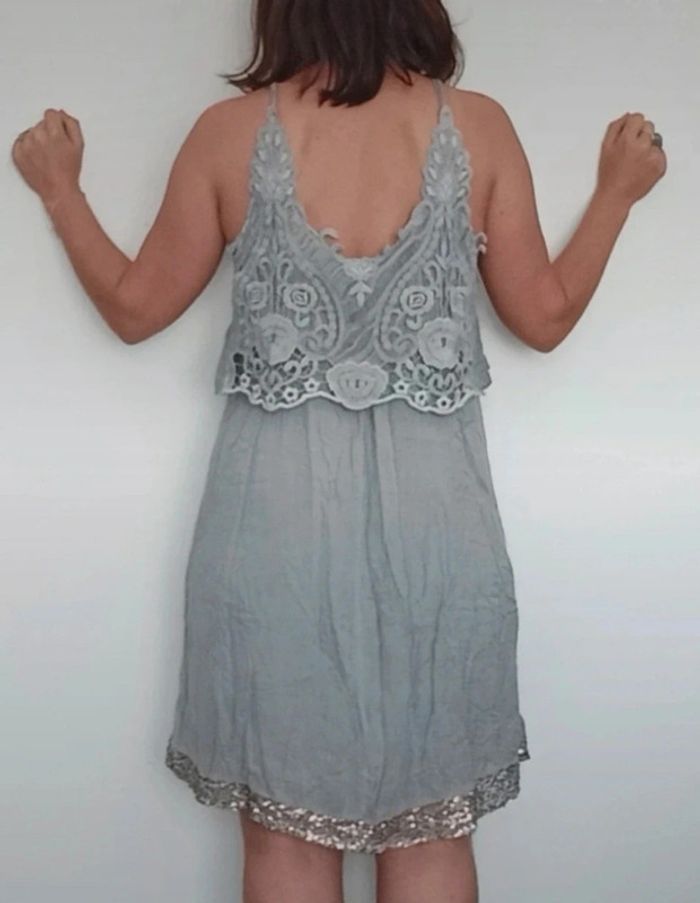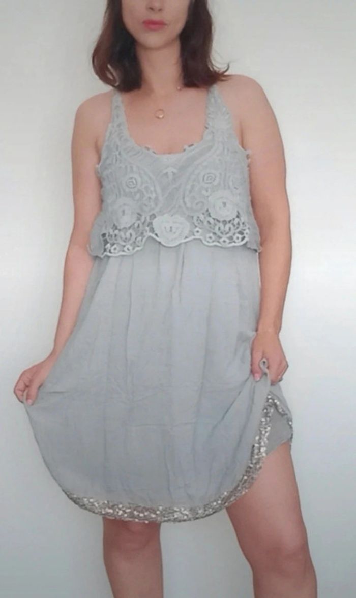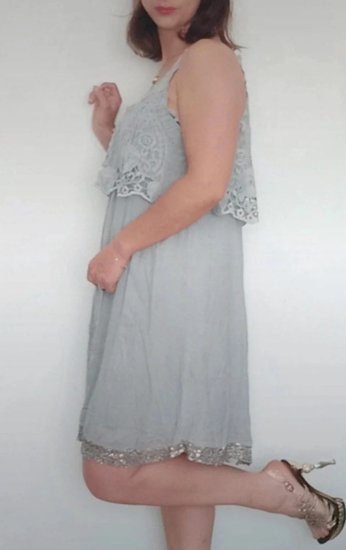 Regardez mes autres articles dans votre taille pour grouper les fdp #poupoupidoutu Robe midi unie grise casual et féminine, buste double crochet, jupe fluide bordure pailletée, bohème chic confortable #robecasual #robeete #robecrochet #robegrise #robeboheme #robemidi #robefluide #robeviscose